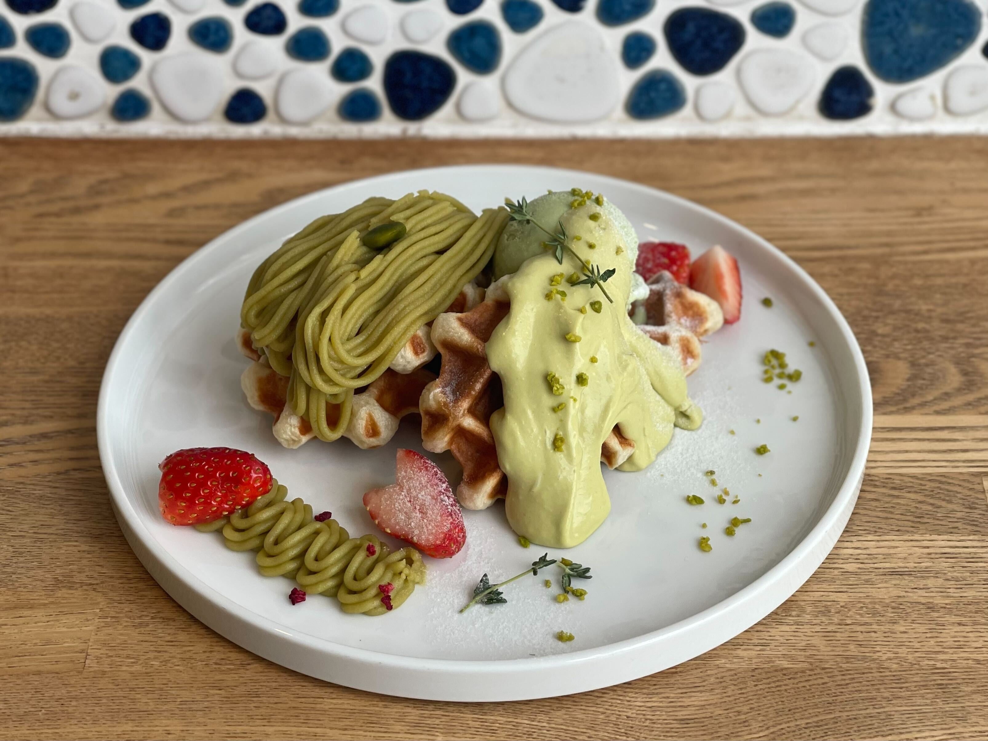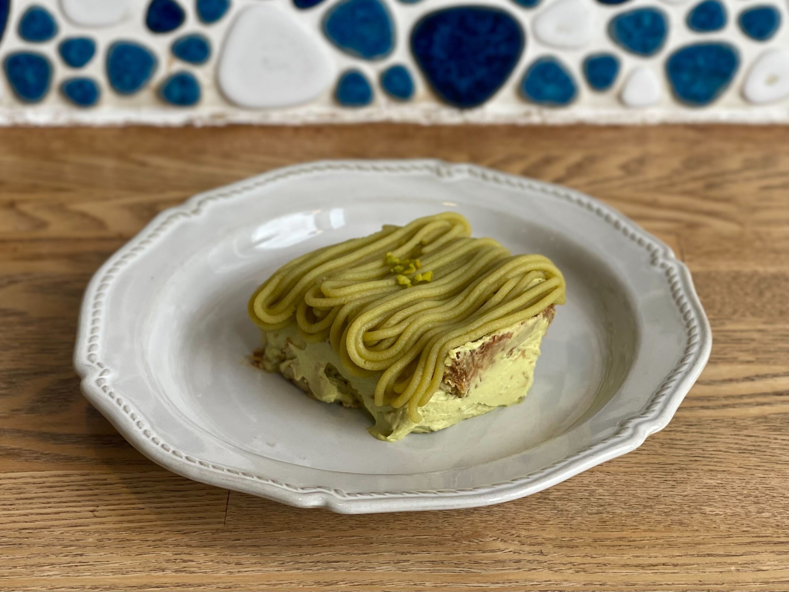 当店自慢のエスプレッソを人気食パン「ムー」にたっぷりと染み込ませた土台を使用。自家製ピスタチオマスカルポーネクリーム、ピスタチオモンブラン、と合わさり今の季節ならではのピスタチオを堪能して頂けます!