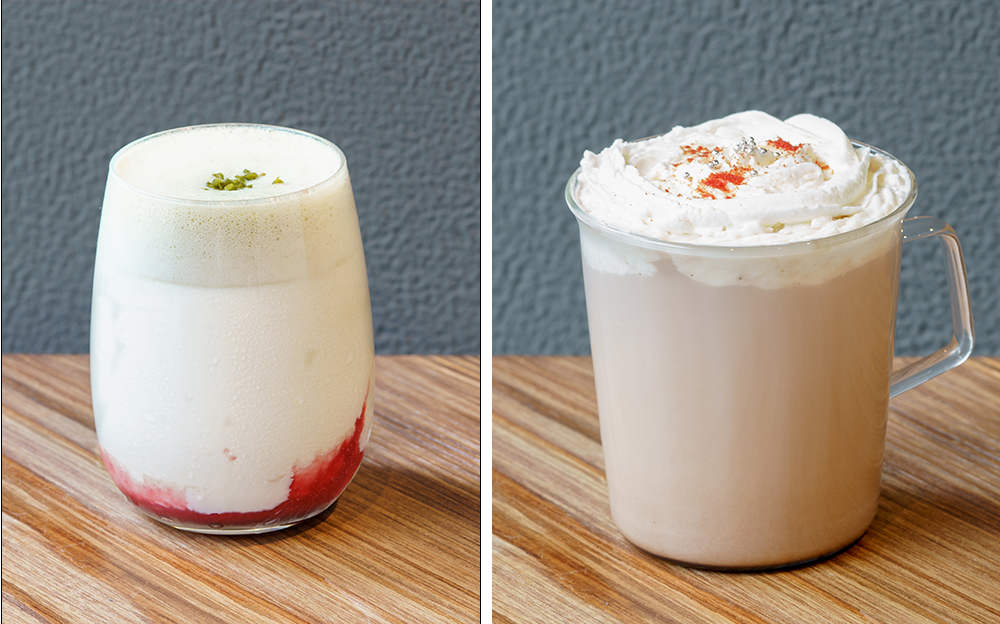 ベリーソース、ラズベリー、ピスタチオをトッピングしており、甘さの中にベリーの酸味がアクセントになり甘酸っぱさも飲み方によって感じれる一杯です。