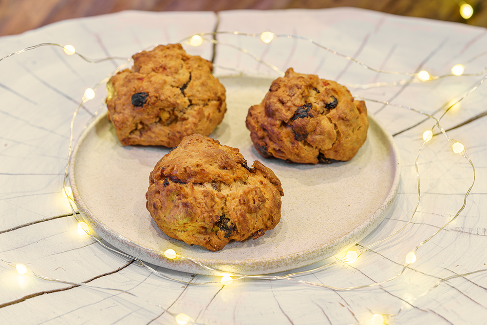 サクサクのスコーン生地にシナモンと洋酒に漬け込んだレーズン、オレンジピール、チェリー、パインそしてアーモンドダイスを練り込み焼き上げました。