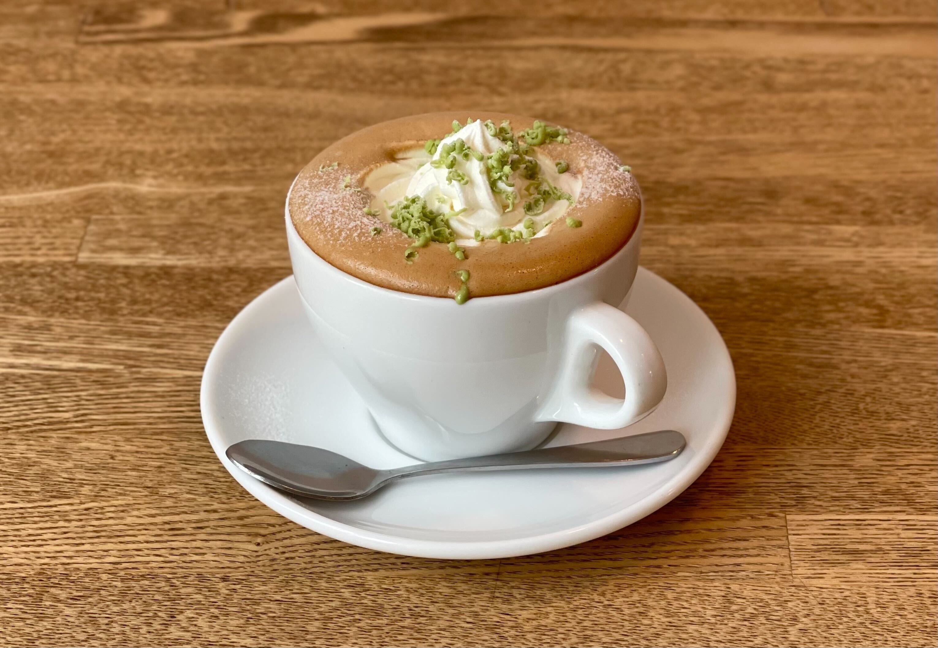 エスプレッソ、チョコレートソース、ピスタチオソースを合わせました。バランスの良いミルクを注ぎクリーム、ピスタチオチョコレートをトッピングしたホッと温まる冬限定ドリンク!