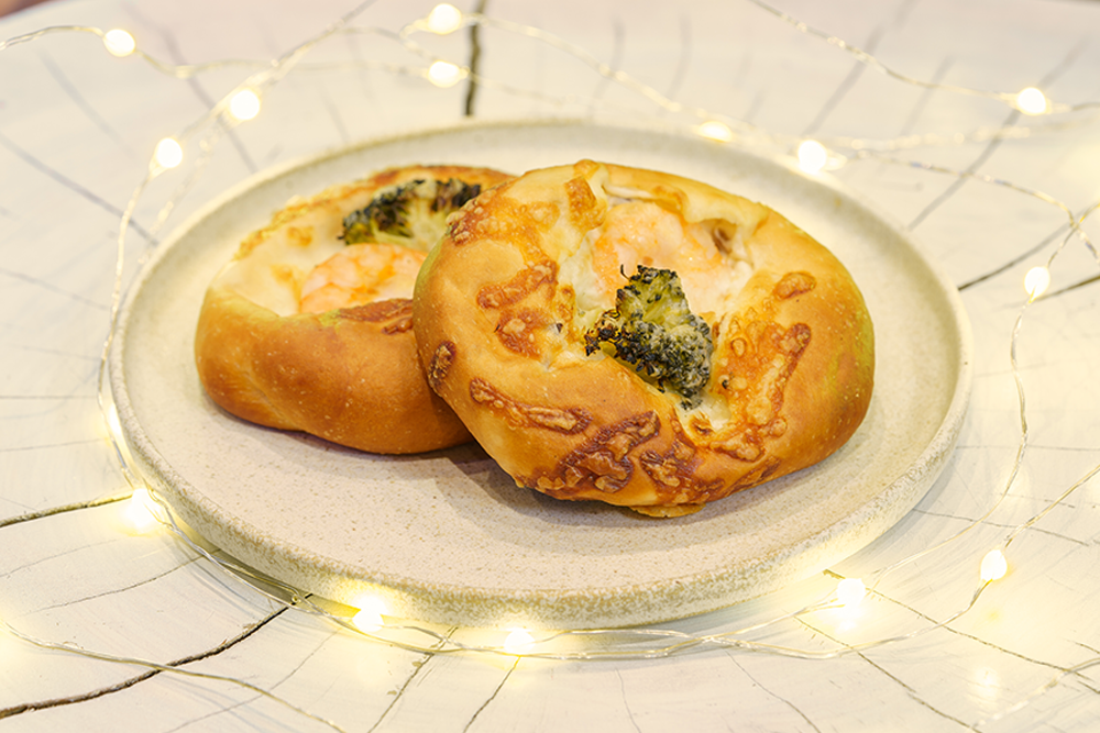 ふわふわの菓子生地にシチューフィリングを包餡し、エビとブロッコリーをトッピング。冬らしい一品。