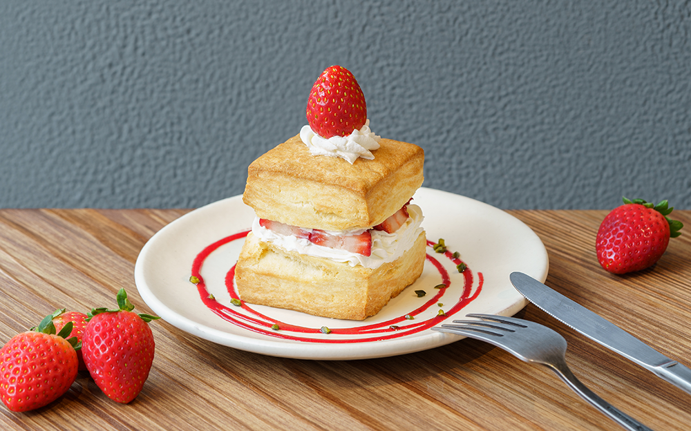 自家製イチゴシロップとフレッシュな苺を抹茶パンとチョコクリームで挟みました。