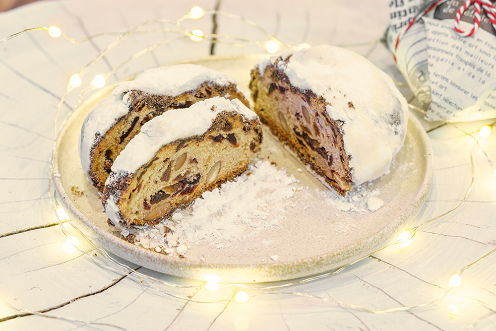 グラッパに漬け込んだレーズン、クランベリーとオレンジカット、クルミ、アーモンドホールを練り込んだ口どけの良いシュトーレン。仕上げにエスプレッソシュガーを纏わせています。