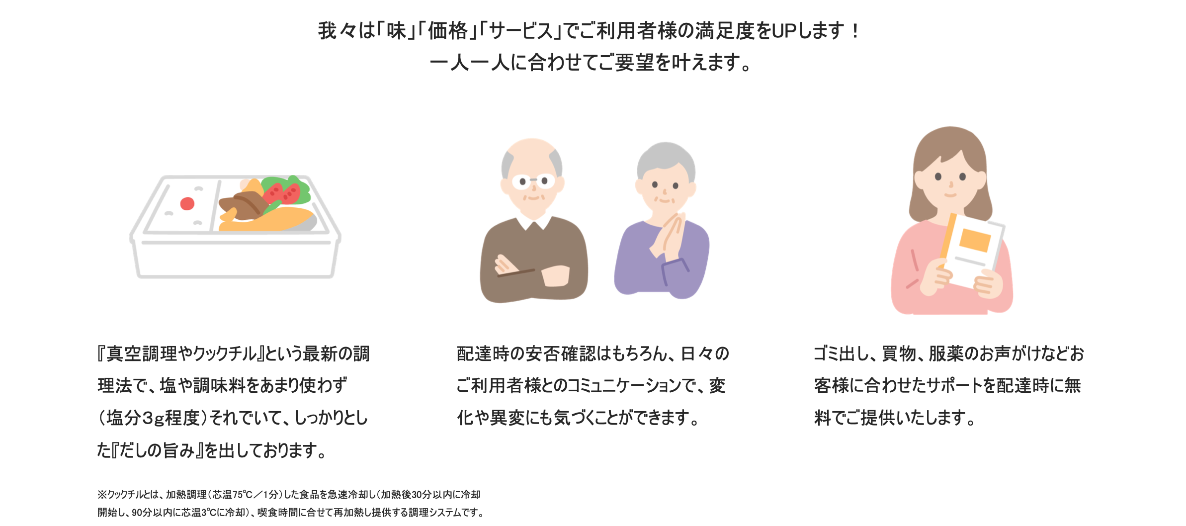 また3分間サービスという、ゴミ出し、買物、服薬のお声がけなどお客様に合わせたサポートを配達時に無料でご提供しております。