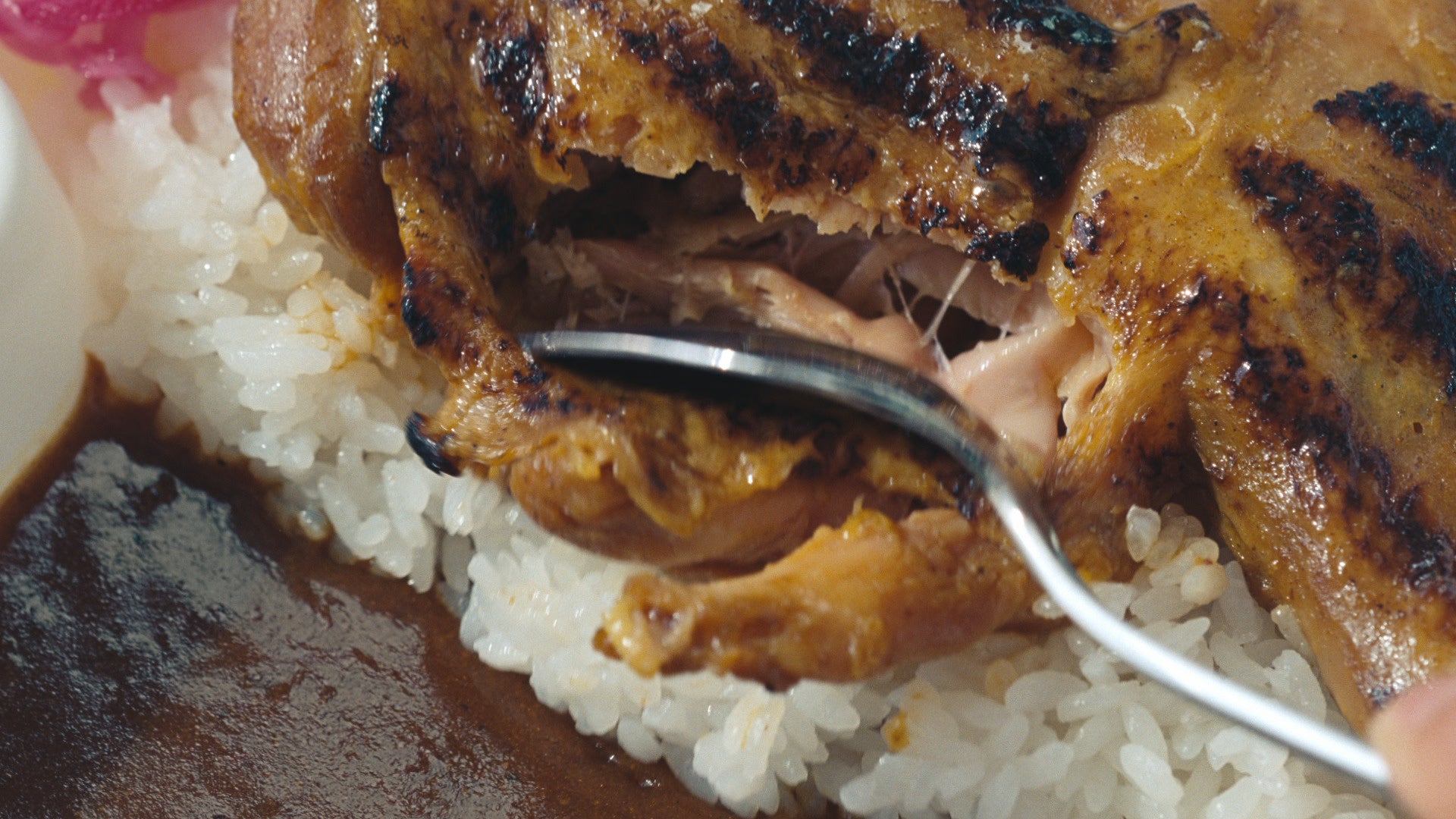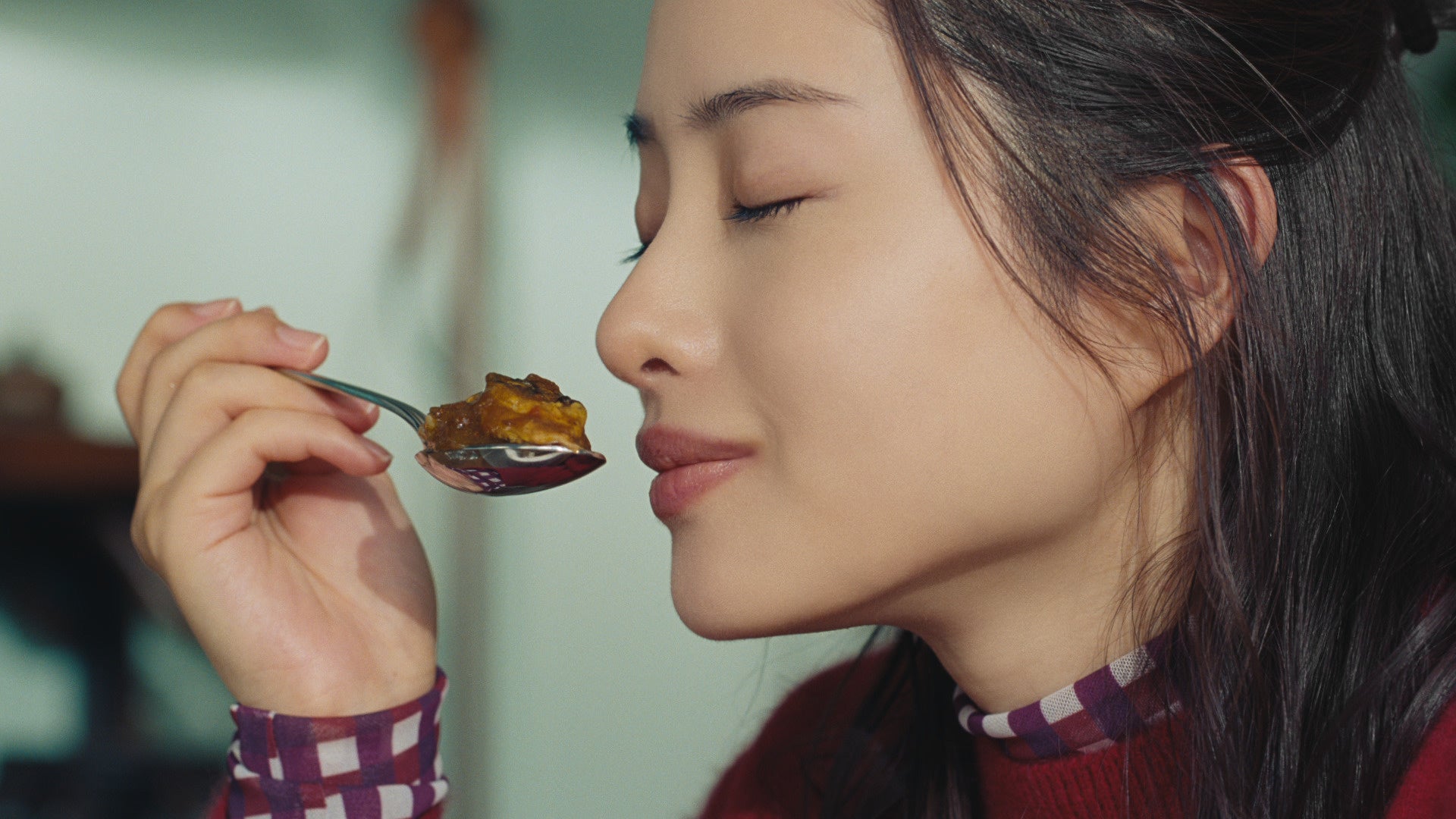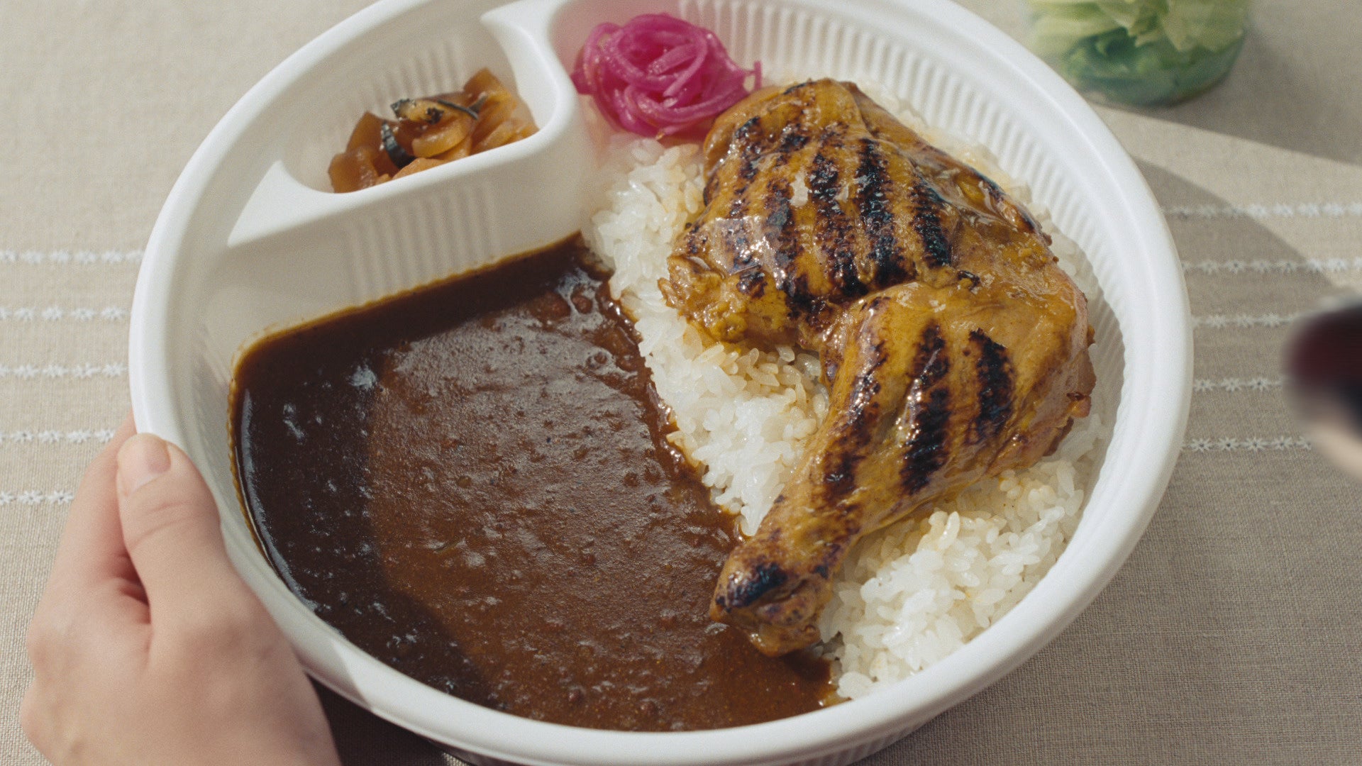 新TVCM「五感」篇では、お家でリラックスする石原さとみさんが、「こりゃかなわん」と炭火の焼き目や香ばしさ、柔らかさを五感で感じながら「炭火焼きほろほろチキンカレー」のおいしさを噛みしめています。「炭火焼き さまさま」と香ばしい味わいの炭火焼きチキンを堪能する石原さんの表情にもご注目ください。