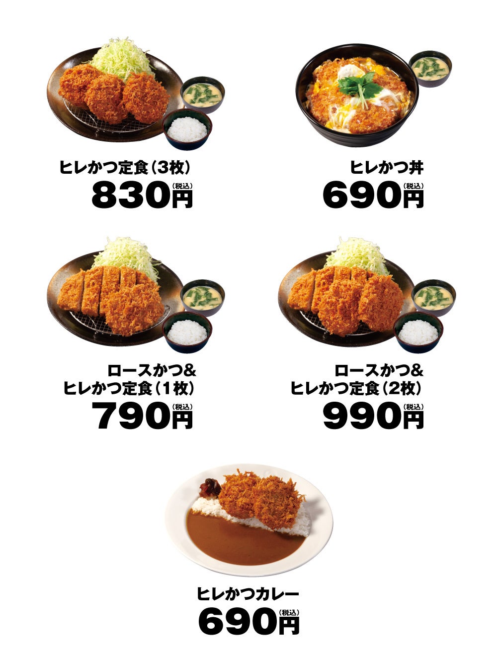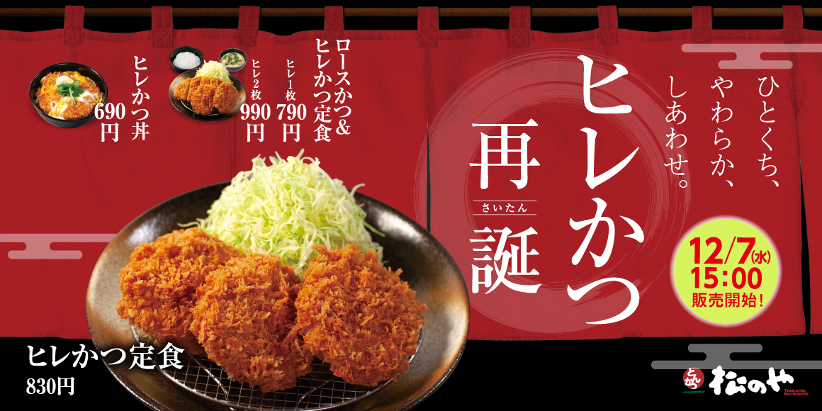 | 商品名 ヒレかつ定食(3枚) 830円 ロースかつ&ヒレかつ定食(1枚) 790円 ロースかつ&ヒレかつ定食(2枚) 990円 ヒレかつ丼 690円 ヒレかつカレー 690円 単品ヒレかつ 230円 ※全て税込価格です。また、店内・お持ち帰りの税込価格は同一です。 ※お持ち帰りいただけます。お持ち帰りのみそ汁は、別途60円でお買い求めいただけます。 ※「ヒレかつカレー」にみそ汁はつきません。 ※「ヒレかつカレー」は松屋との併設店、マイカリー食堂との併設店、沖縄県店舗では販売いたしませんのでご了承ください。 発売日 2022年12月7日(水)午後3時 |
