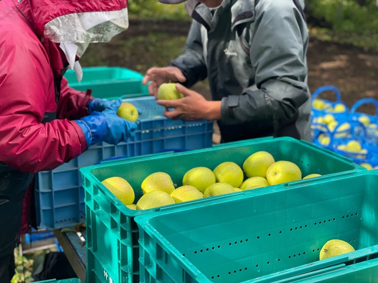 1年目は「軸が無い」、「キズ、シミ、色むらがある」などの理由で一般規格から外れてしまう(規格外)サンふじを販売、2、3年目は「赤く色づくようにする」「外観で選別する」「サイズを細かく分ける」といった作業を削減したりんごを販売するなど、りんごの味を左右する作業は残しつつ、おいしいりんごの生産に毎年試行錯誤を続けています。