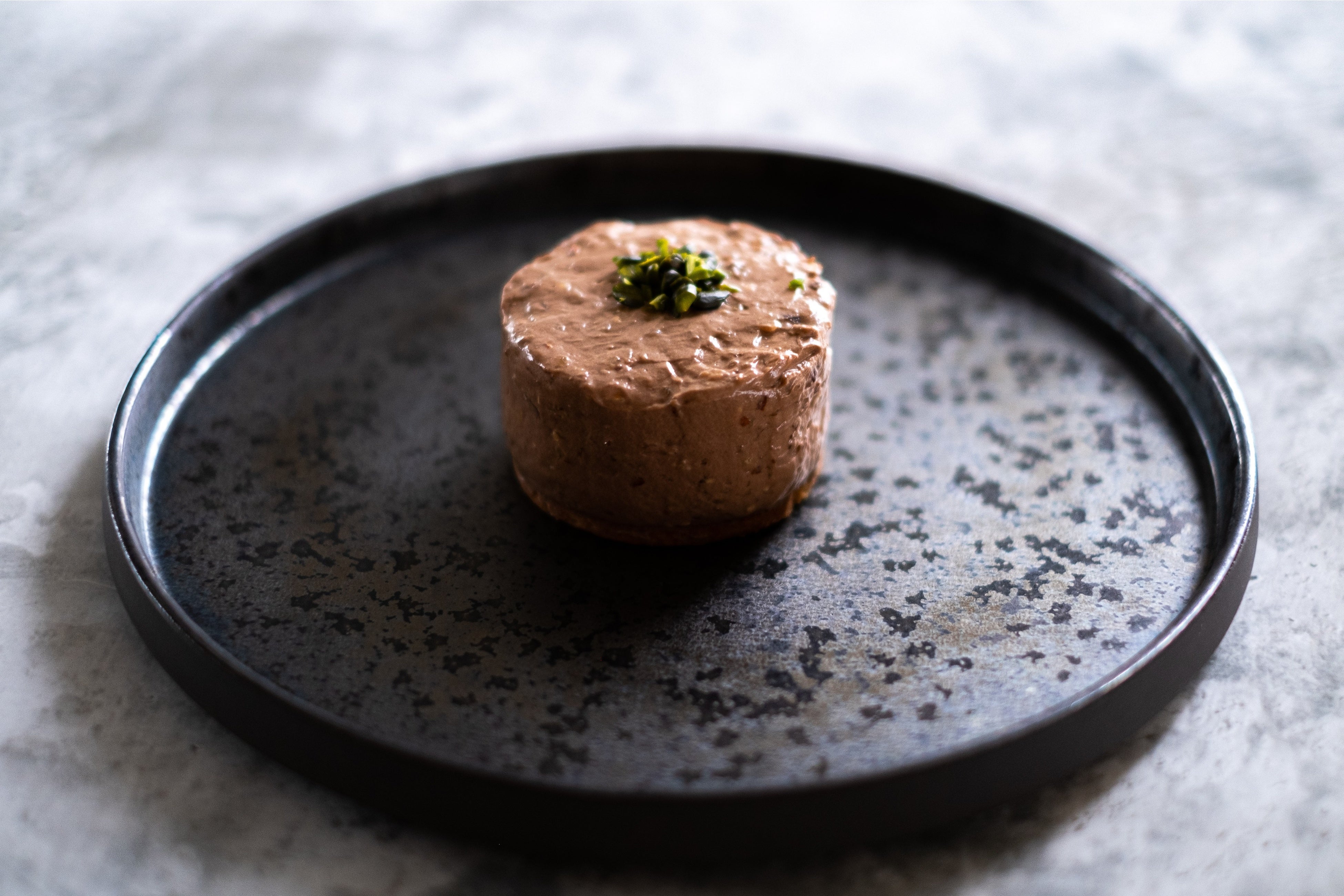 フェアトレードラベル認証された「Divine(ディバイン)」のダークチョコレートを使用したムースケーキです。アクセントに、ピスタチオをトッピング。豆乳と甜菜糖の自然な甘みをお楽しみください。