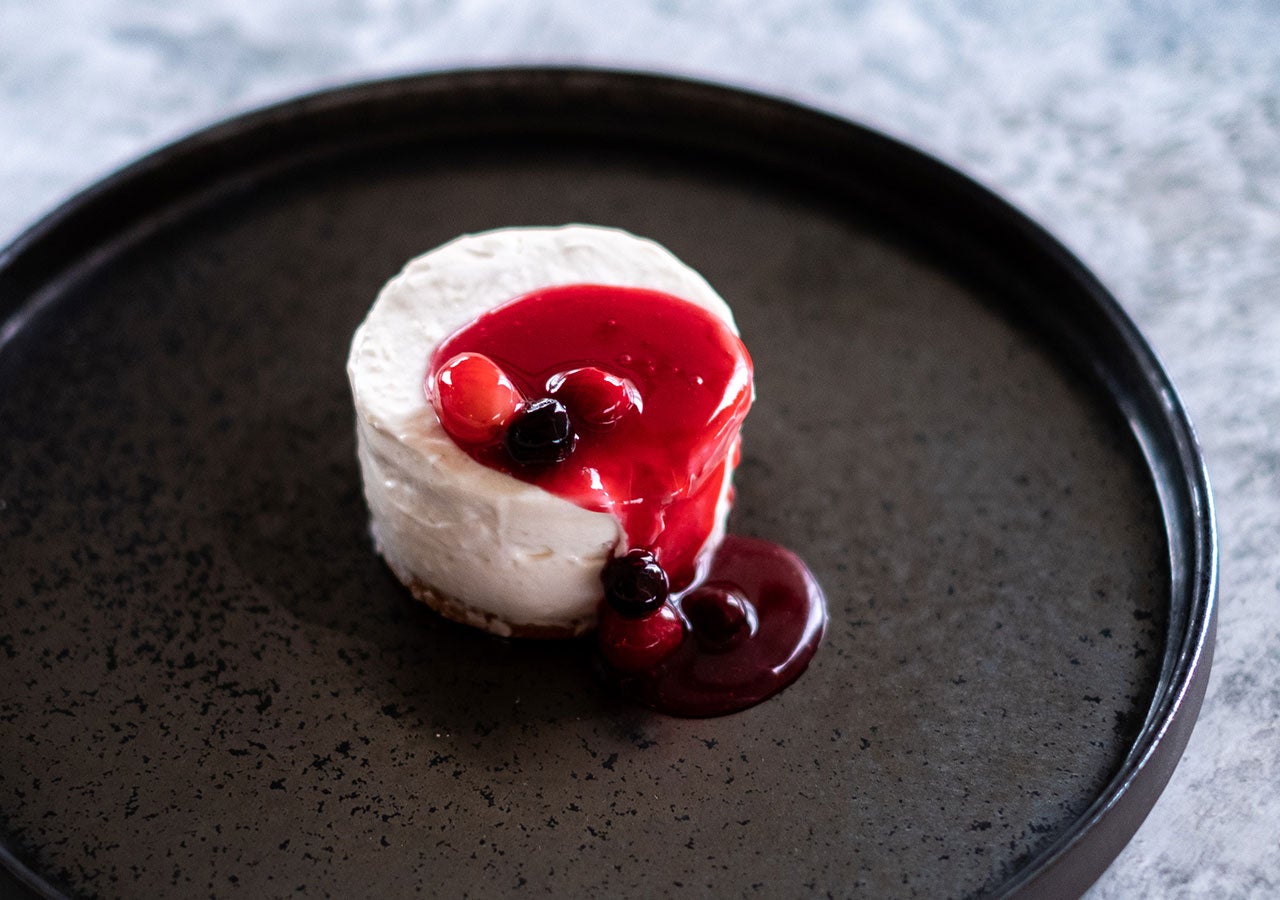豆乳ヨーグルトのムースケーキに、華やかなベリーソースをかけた一品です。ソースは「規格外いちご」とラズベリー、ブルーベリーを使用しています。甘酸っぱい優しい味わいで、お子様にもおすすめです。