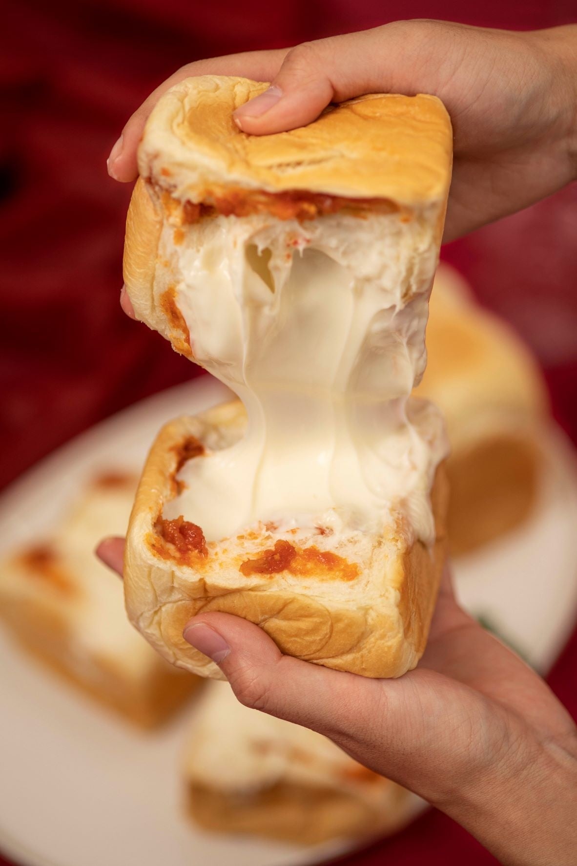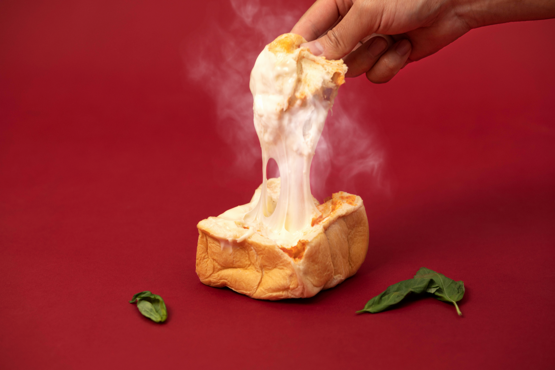 焼かずに蒸したことで、生地の水分量が多いSTEAM BREAD。レンジで温めると、水分が加熱され、よりしっとり、もっちりする特徴があります。その特徴と相まって、温められたチーズは食パンの中からとろけ出し、まるでチーズフォンデュのような贅沢な食べ方を食パンで実現しました。