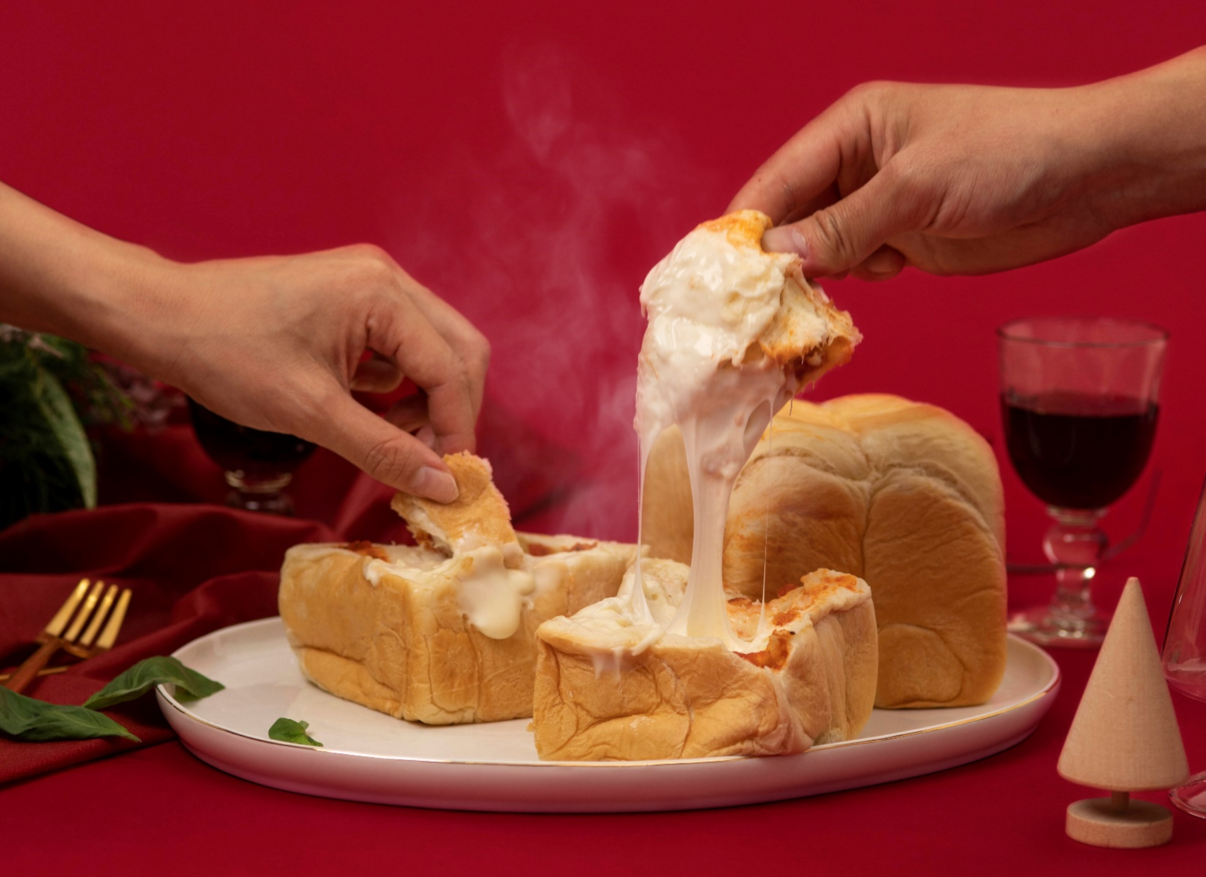 激動の2022年を振り返り、「食パンをシェアしながらみんなで楽しむ喜び」をお届けしたいという想いから、新しいスチーム食パンの魅力を追求しました。ワクワクを掻き立てる、オリジナルBOXも制作しました。今にもとろけ出しそうなチーズが入った食パンを皆で囲い、アッと驚くようなビジュアルを楽しんでいただけます。