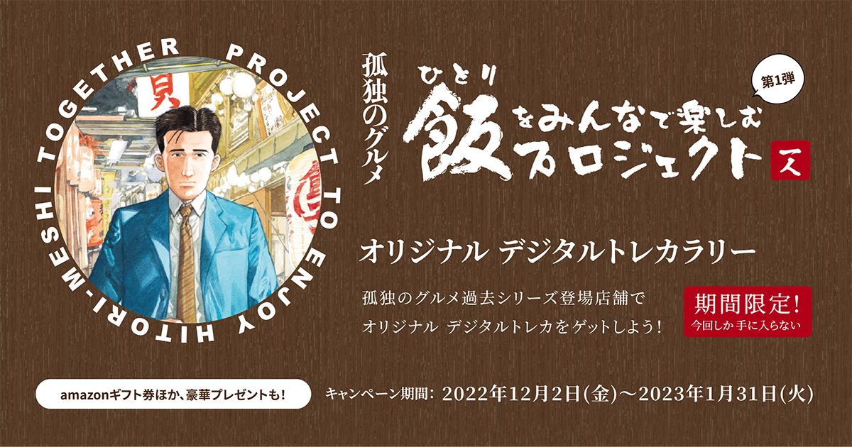 「ひとり飯をみんなで楽しむプロジェクト」とは、主人公・井之頭五郎が仕事の合間に飲食店に立ち寄って食事を楽しむ様を描いた作品『孤独のグルメ』の世界観を踏襲し、「ひとり飯」仲間を世の中にどんどん広げていこうとするプロジェクトです。第1弾として、『孤独のグルメ』の過去シリーズに登場したお店で食事をすると、各店舗オリジナルのデジタルトレカがもらえるトレカラリーを実施します。