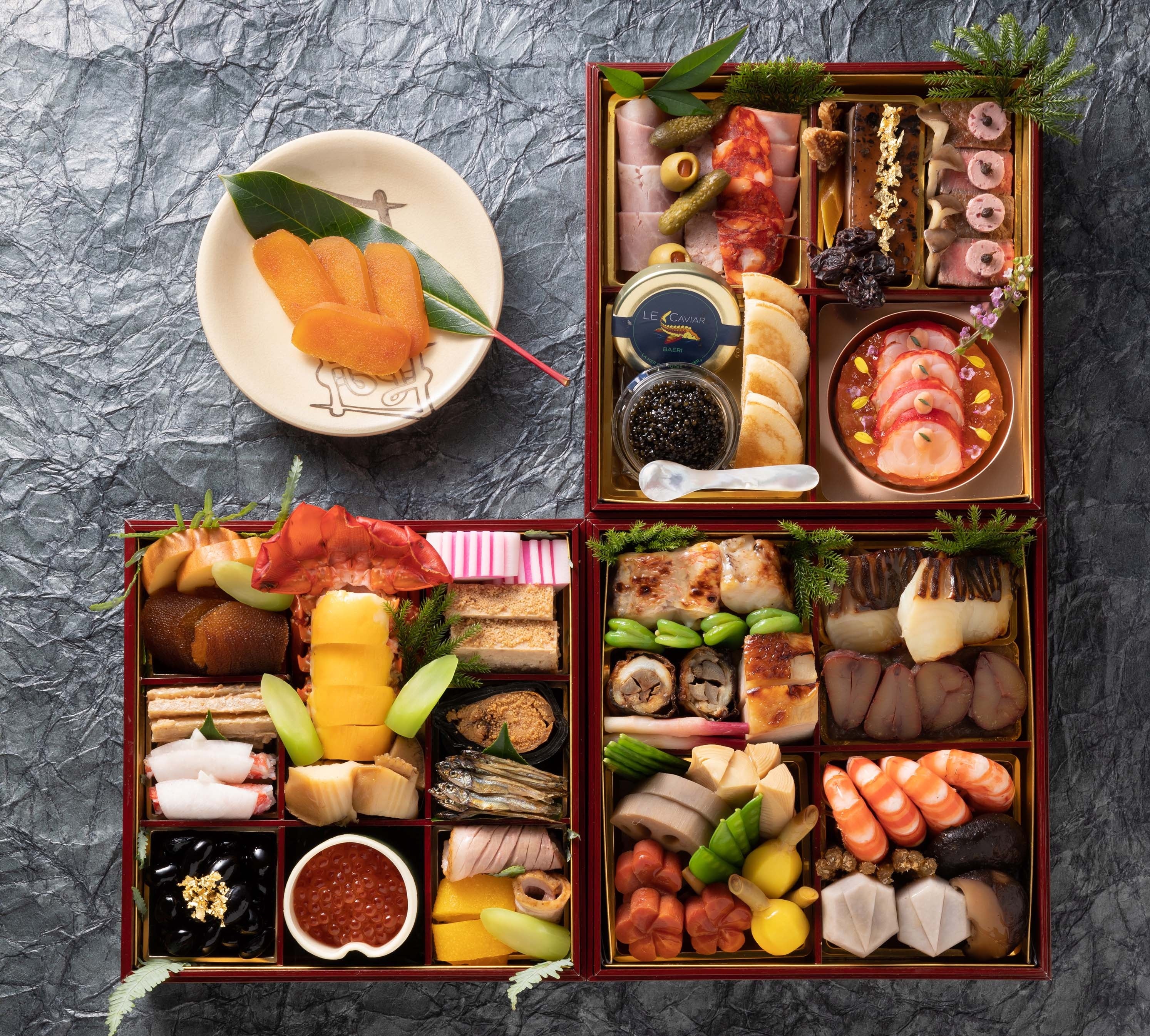 フランスの 3 つ星レストランでの経験や世界料理オリンピック銀メダルなど数々の料理コンクール受賞歴を持つホテルグランヴィア京都 総料理長 柏木健一(かしわぎけんいち)がフレンチを中心とした洋食メニューを担当し、和食「浮橋」の料理長を務め、ホテルグランヴィア京都の和食部門を統括する三浦 覚(みうらさとる)が和食メニューを担当。ふたりの匠の技が光る豪華な和洋三段重をご用意いたしました。新年を祝うシャンパンやワイン、日本酒などとも好相性なメニューのラインナップが並びます。