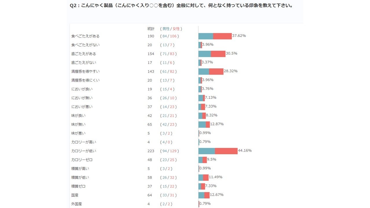- 「こんにゃく製品(こんにゃく入り○○を含む)全般に対して、何となく持っている印象を教えて下さい。」という質問に対しては、44.16%が「カロリーが低い」、37.62%が「食べごたえがある」と回答し、大多数の人が蒟蒻に対してヘルシーなイメージを持っていることがわかりました。