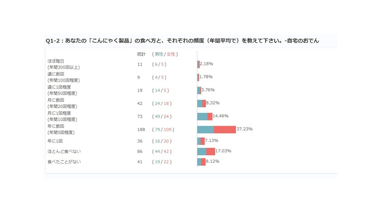 - 「こんにゃく麺」や「コンビニのおでん」などの様々な「こんにゃくの食べ方」について、それぞれの消費頻度を質問しました。