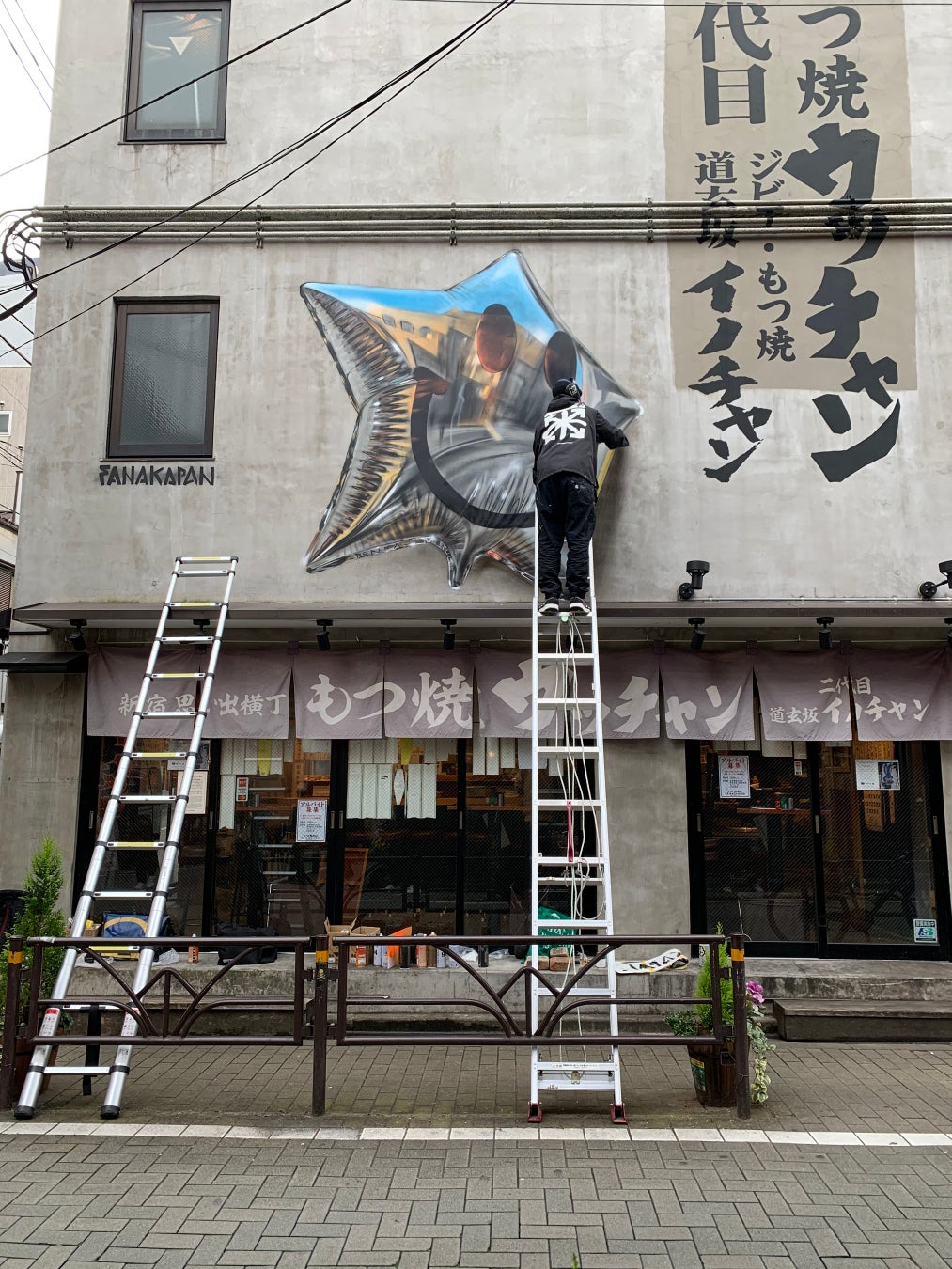 来日中に新橋もつ焼きウッチャン(東京都港区新橋2-8-14)の外壁にバルーン作品を描く予定です