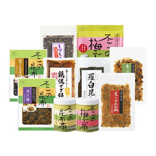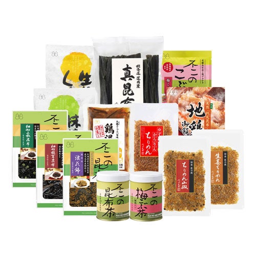 ロングセラーの不二の昆布茶・梅こぶ茶をはじめ、甘辛い味付けが人気のちりめん佃煮。北海道道南産真昆布を使用した昆布佃煮・なめらかな食感と優しい甘さのくず湯。丸鶏スープの旨味が効いた混ぜご飯の素・天然昆布と炊く炊き込み御飯の素。お鍋におすすめのだし昆布・梅こぶ茶味の揚げおかき。バラエティー豊かな全14品を、ネット通販限定価格でおたのしみ頂けます。