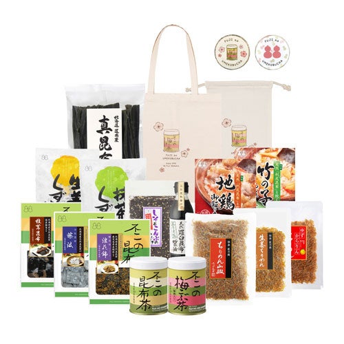 ロングセラーの不二の昆布茶・梅こぶ茶をはじめ、北海道道南産真昆布を使用した昆布佃煮。甘辛い味付けが人気のちりめん佃煮・天然昆布と炊く炊き込み御飯の素。お鍋におすすめのだし昆布・なめらかな食感と優しい甘さのくず湯。三年かけてじっくりと熟成された醤油と昆布の旨みが味わい深い昆布醤油・ 梅こぶ茶のイラストのグッズ(ミニ巾着・エコバッグ・マスキングテープ)。ボリューム満点の全18品を、ネット通販限定価格でおたのしみ頂けます。
