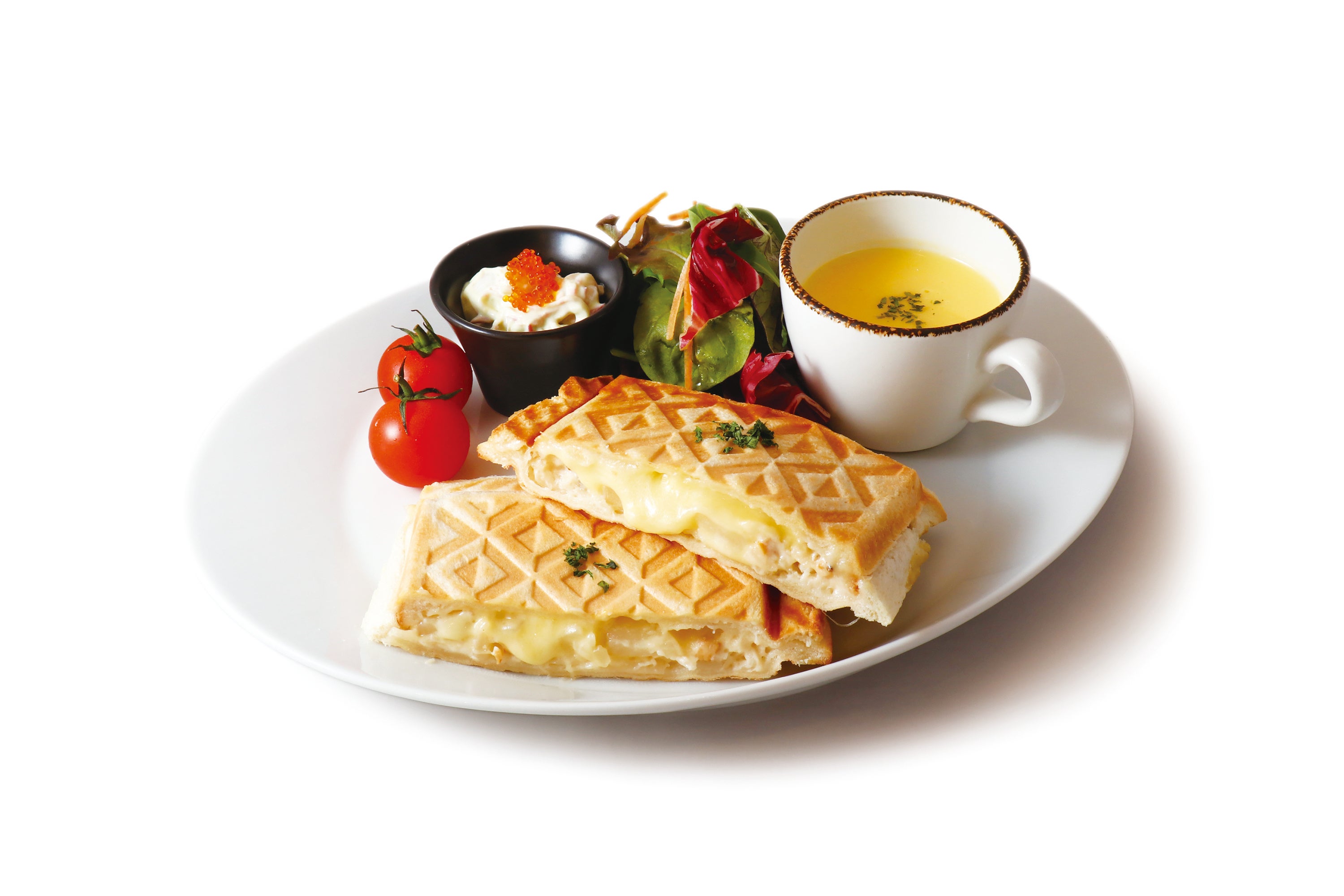 鴨肉のスライス、燻製チーズのポテトサラダを食パンに挟み、ホットサンドに仕上げました。