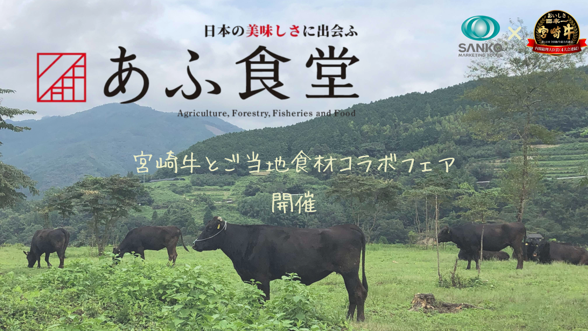 株式会社SANKO MARKETING FOODS(本店:東京都中央区、代表取締役:⻑澤成博、証券コード:2762、以下「当社」といいます。)は、2022年12⽉5⽇(⽉)〜2022年12⽉9⽇(⾦)の期間、当社農林⽔産省運営受託店舗『あふ⾷堂』にて、宮崎牛のブランドを広げていくことを目的とした『宮崎牛と郷土料理を楽しむ宮崎フェア 』を開催し『宮崎⽜』を使ったすき焼きメニューや宮崎県のご当地メニューの販売を行います。