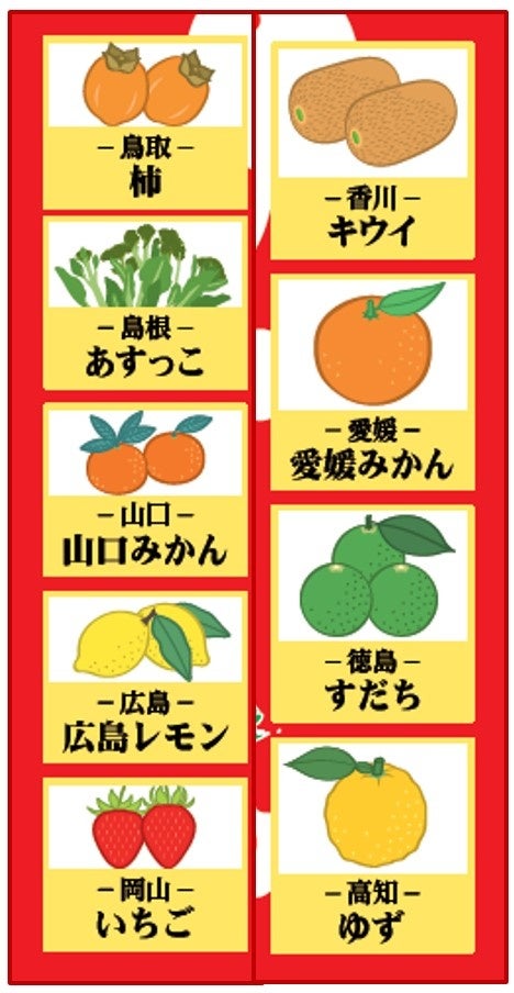 ・各県の名産品をデザイン(鳥取県:柿、島根県:あすっこ、山口県:山口みかん、広島県:広島レモン、岡山県:いちご、香川県:キウイ、愛媛県:愛媛みかん、徳島県:すだち、高知県:ゆず)・アルコール分1%未満
