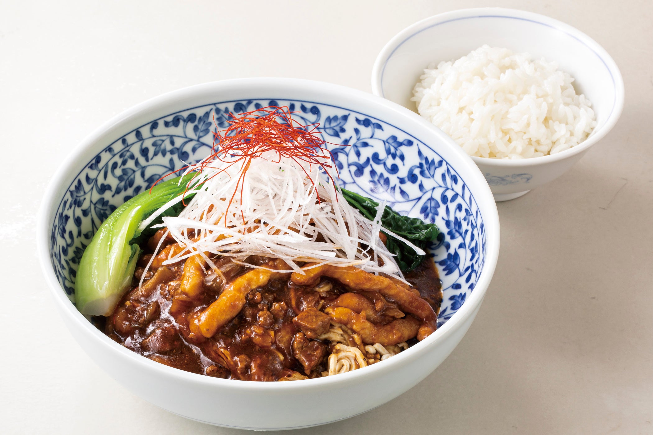 低糖質・高たんぱくな中国料理の伝統食材「豆腐干絲(干し豆腐)」を香ばしく焼いた麺に、甜面醤(テンメンジャン)を加えた特製のジャージャー麺。日本で一般的な挽肉ではなく細切りの豚肉をメインに使用し、搾菜(ザーサイ)も加えるなど、香港風に仕上げました。お付けする小椀のご飯で、ピリ辛タレまで余すことなくご堪能いただけます。