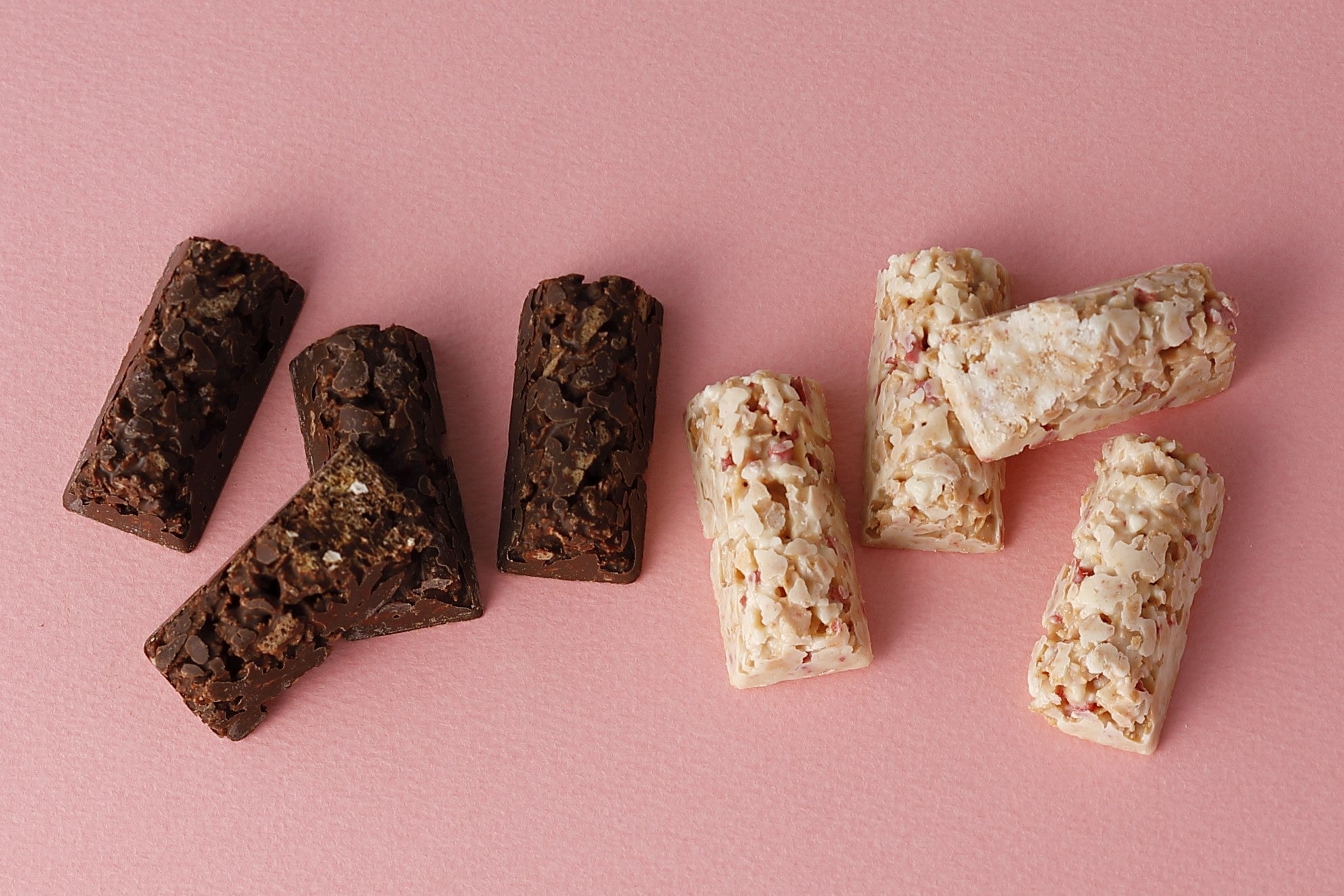 チョコレートに練り込んだ砕いたフイユティーヌ(クレープ生地)、クッキーなどが、さくさくと浮き立つような食感を演出するチョコレート菓子。
