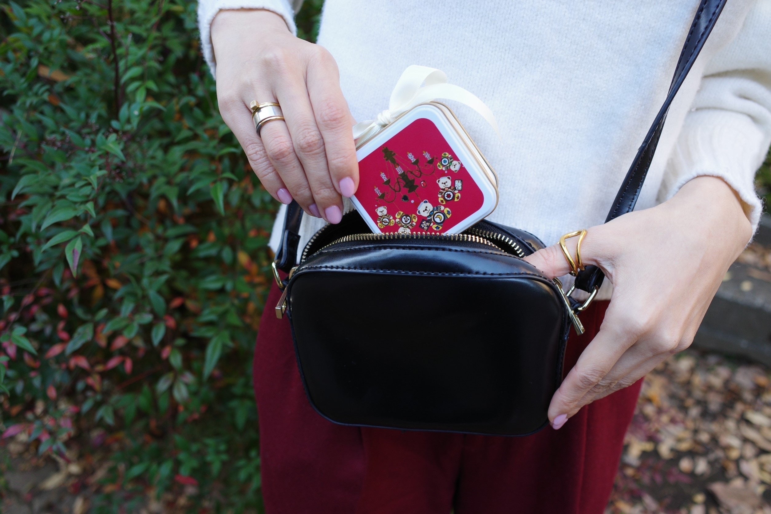サンタくまが青山デカーボのお菓子缶を持っていたり、
