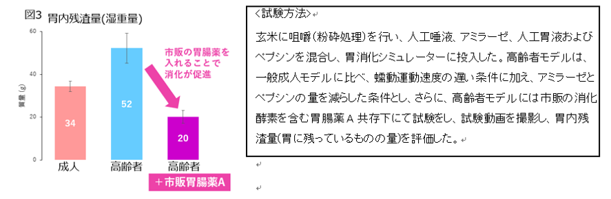 消化酵素を含む胃腸薬を用いて、高齢者モデルで玄米の消化能力を確認したところ、高齢者モデルの胃内残渣量は一般成人モデルよりも減少しました(図3)。これらの条件においては、消化酵素を含む胃腸薬が、加齢とともに衰えた高齢者の胃の消化能力をサポートするということが示唆されました。