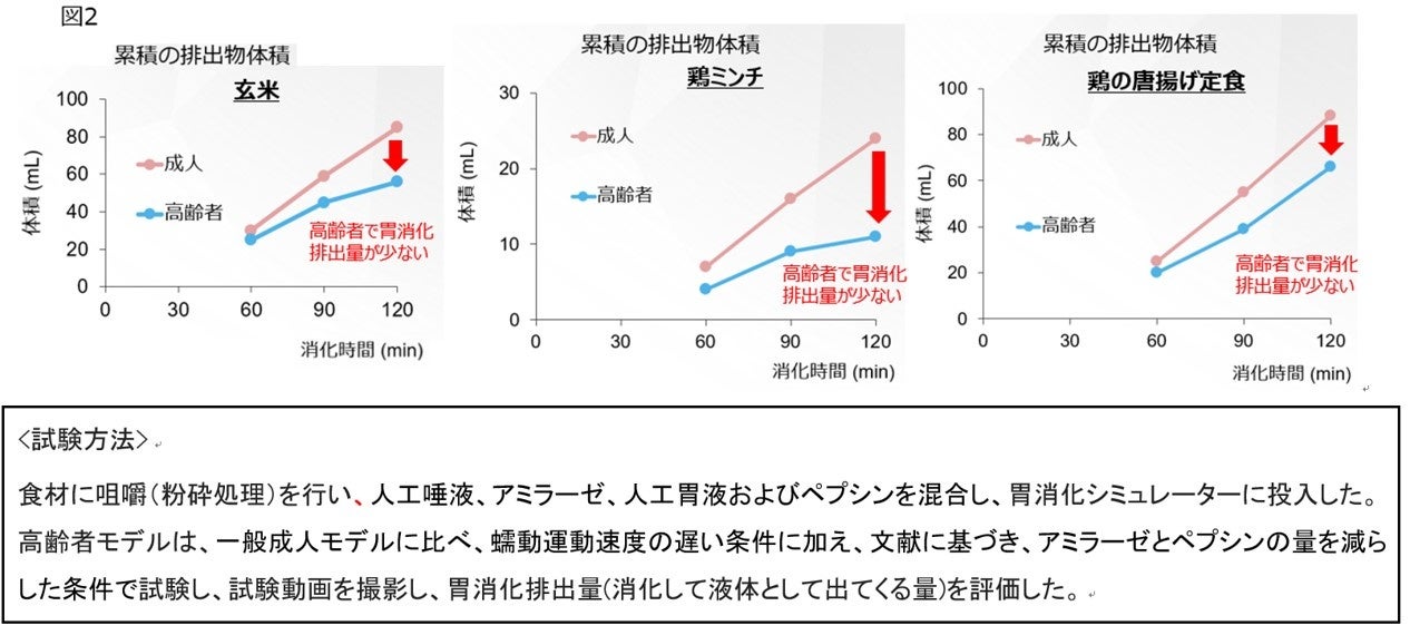 成人と高齢者で食材により消化のレベルに違いがあるかを評価するため、炭水化物の多い「玄米」、タンパク質の多い「鶏ミンチ」、そして一般的な食事を模した「鶏の唐揚げ定食」の3種類で、一般成人モデルと高齢者モデルで、胃消化シミュレーターを用いて消化能力を検証しました。その結果、玄米、鶏ミンチ、鶏の唐揚げ定食で一般成人モデルと比べて高齢者モデルでは、消化終了時の胃から排出される量が少ないことが分かりました(図2)。この結果、高齢者は成人よりこれら食材の消化能力が落ちていることが示唆されました。また興味深いことに、健康的と考えられ、食物繊維の多い玄米でも、加齢により消化能力が落ちるということが示唆されました。