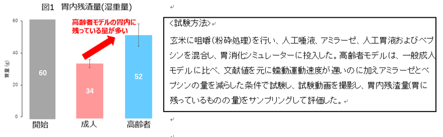成人と高齢者の胃の消化能力を比較するため、胃消化シミュレーターを用い、高齢者モデル、および一般成人モデルの系を確立しました。その食材として、玄米を用いて可視化検証を行っています。その結果、消化終了時の胃内残渣量については、高齢者モデルは一般成人モデルに比べて約1.5倍残存していることがわかりました(図1)。これらの条件においては、高齢者は消化能力としては、一般成人に比べ、約2/3に落ちていることが示唆されました。