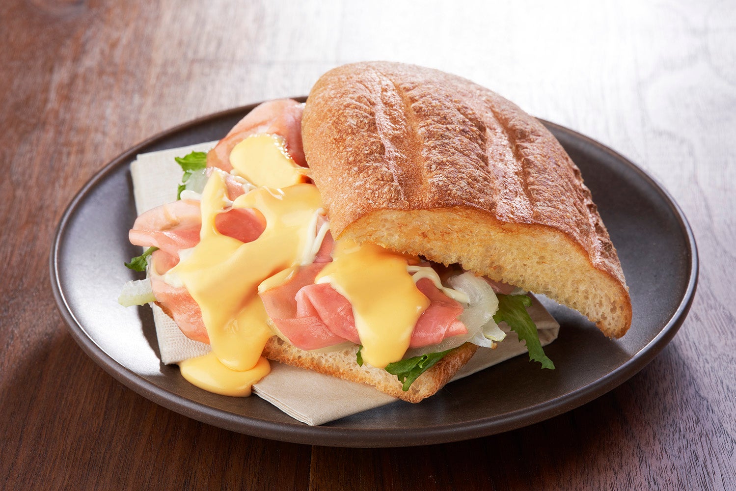 ボリュームのあるオリジナルのパニーニは、ストレート製法で生地をつくり、小麦粉本来の素朴で香ばしい風味にこだわり焼き上げております。ホットサンド専用生地で、ご提供前に焼き上げることで、表面はザクッとクリスピーに中はしっとりもちもちの食感が楽しめます。具材に負けない生地の存在感を感じてください。