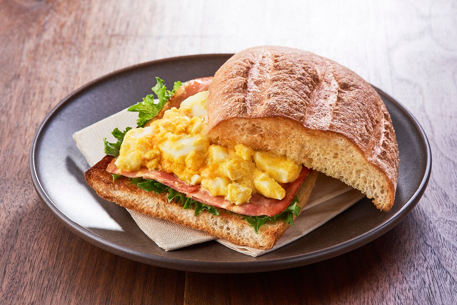 サンマルクカフェオリジナルのタマゴサラダとこんがり焼いたベーコンをサンドしました。ゆで卵がゴロゴロっと入りタマゴのコクとまろやかさがポイントです。シンプルだからこそ美味しい一品です。