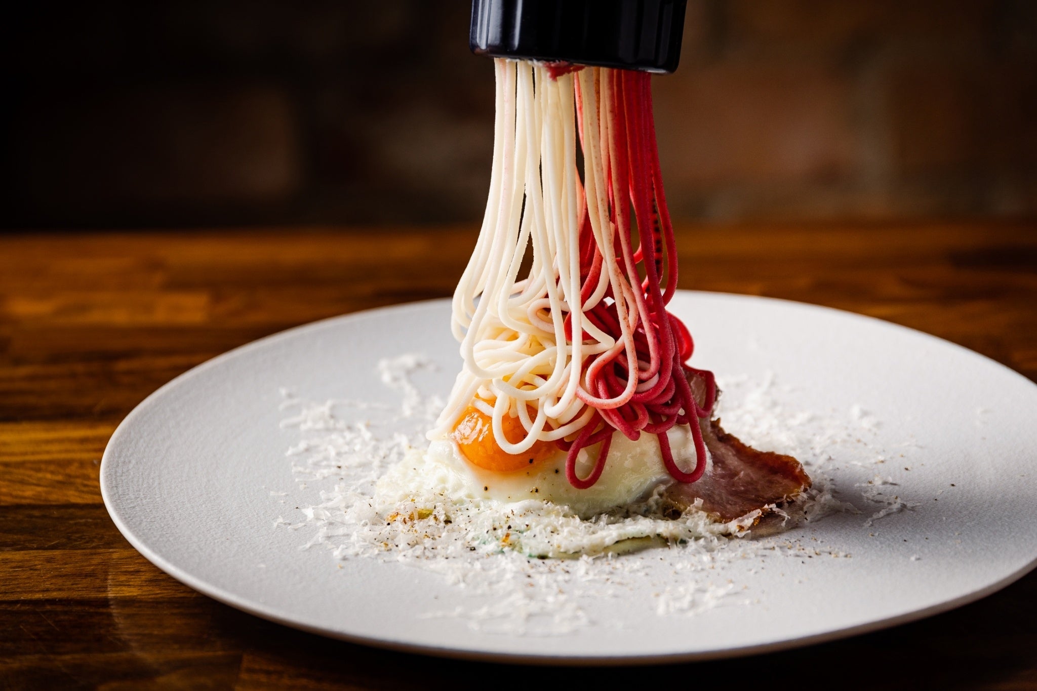 お皿にデザインされた「ブラータチーズと季節果物のフルーツサラダ」はおやつ変わりにも目でも楽しんでいただけます。その他モンブラン風に目の前で仕上げる「ベーコンエッグポテトサラダ」は思わずスマホをとってしまう一皿。