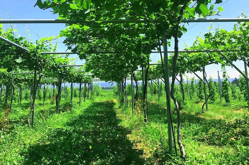 自社農園(八雲ヴィンヤード)は風通しがよく、南向きの傾斜地で水はけのよい粘土質土壌。化学肥料・除草剤不使用の草生栽培と細やかな栽培管理による減農薬栽培(リュット・レゾネ)を実践。最低限の防除のみに抑えて、あとは有機農法で対応し、ぶどうが自ら生きようとする環境を整えて健全でパワフルなぶどうに育てています。細かな作業ひとつひとつを、スタッフひとりひとりがスペシャリストとして丁寧に行い、みんなで本当においしいワインを造る、実直なワイン造りを実践しています。