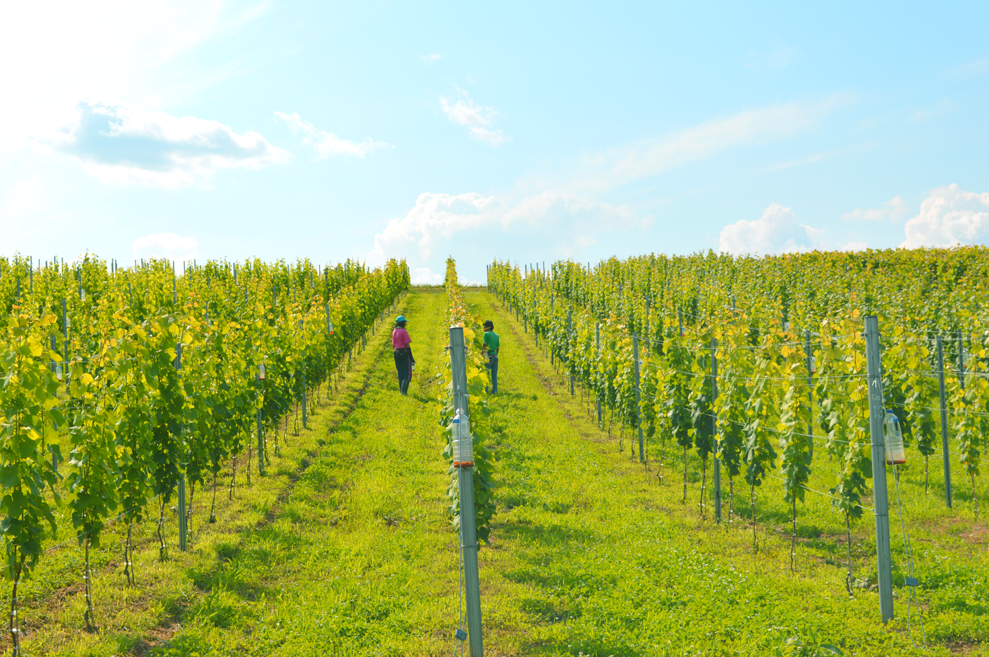 冷涼な酸味と果実味があり、重くないがエキス感があって飲み心地がいい。そんな大迫町らしさをワインで表現しています。栽培で最も重視しているのは、ヴェレゾン期(色づき)までに房の健全性を保つこと。ひと房ひと房、病果を丁寧に取り除くことで、収穫時期に選果をしなくても健全なぶどうだけを収穫することができます。結果として、健全な発酵を促し、クリアな味わいのワインに仕上がります。