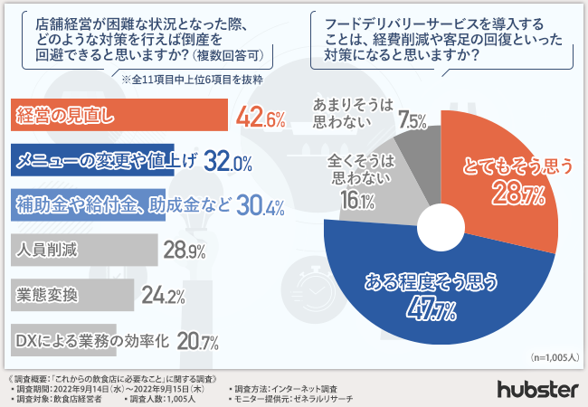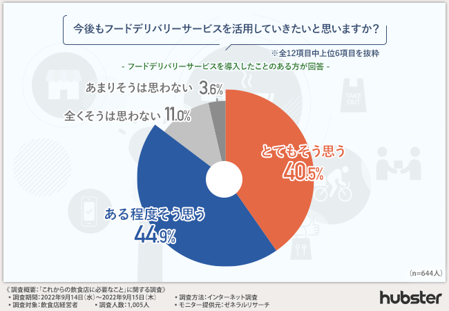 ここまでの調査で、フードデリバリーサービスは経費削減や客足の回復といった経営対策になると考えている経営者は多く、既に導入している飲食店のリピーター率は8割以上ということが明らかになりました。
