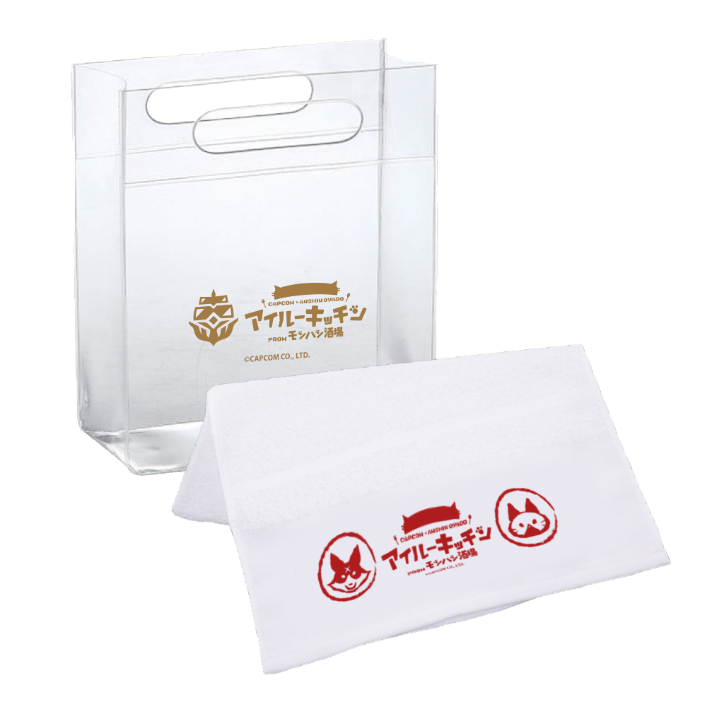 ※グッズ:アイルーキッチンオリジナルタオルとクリアバッグ、王域三公がデザインされたアクリルスタンド