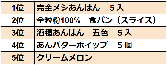 第1位は、8月に限定数を販売開始した日清食品とのコラボ商品「完全メシあんぱん 5入」となりました。続いて「全粒粉100% 食パン(スライス)」「酒種あんぱん 五色 5入」がランクインしており、創業から変わらずに皆さまに愛されている酒種あんぱんに加え、2022年に販売を開始した新たな全粒粉100%シリーズ食パンもご好評いただいている傾向がわかります。また、販売を再開して間もない「あんバターホイップ」は根強い人気で4位入り、果肉感をアップさせたメロン果肉入りのクリームが人気の「クリームメロン」も上位に入っています。