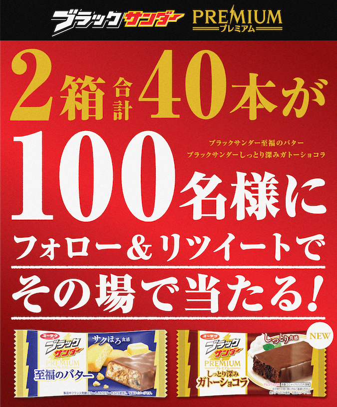 ラックサンダー公式Twitterアカウント(@Black_Thunder_)をフォローし、指定のツイートをリツイートすると、抽選で100名様に「ブラックサンダー至福のバター」「ブラックサンダーしっとり深みガトーショコラ」を1箱ずつ、合計2箱(40本入り)をプレゼントいたします。