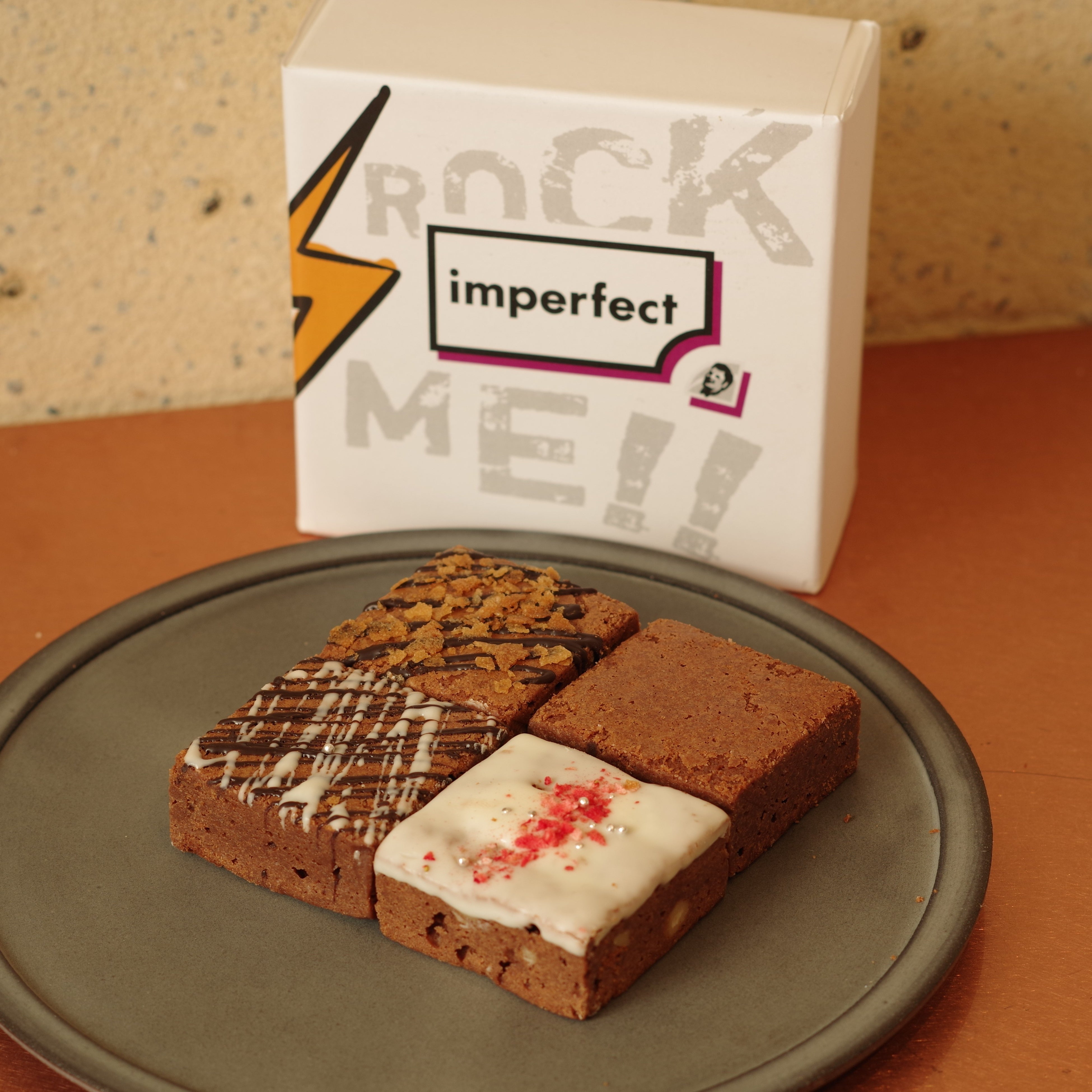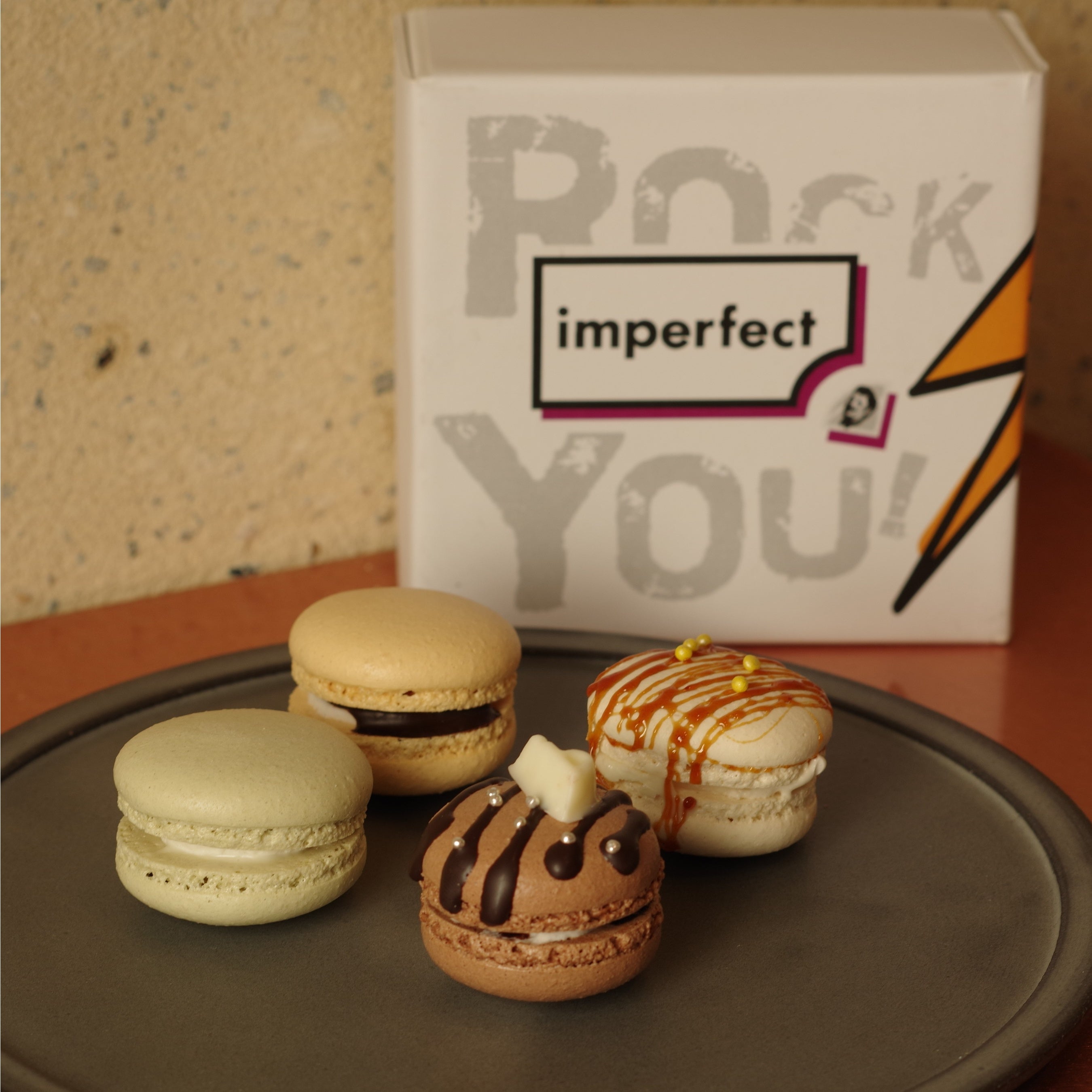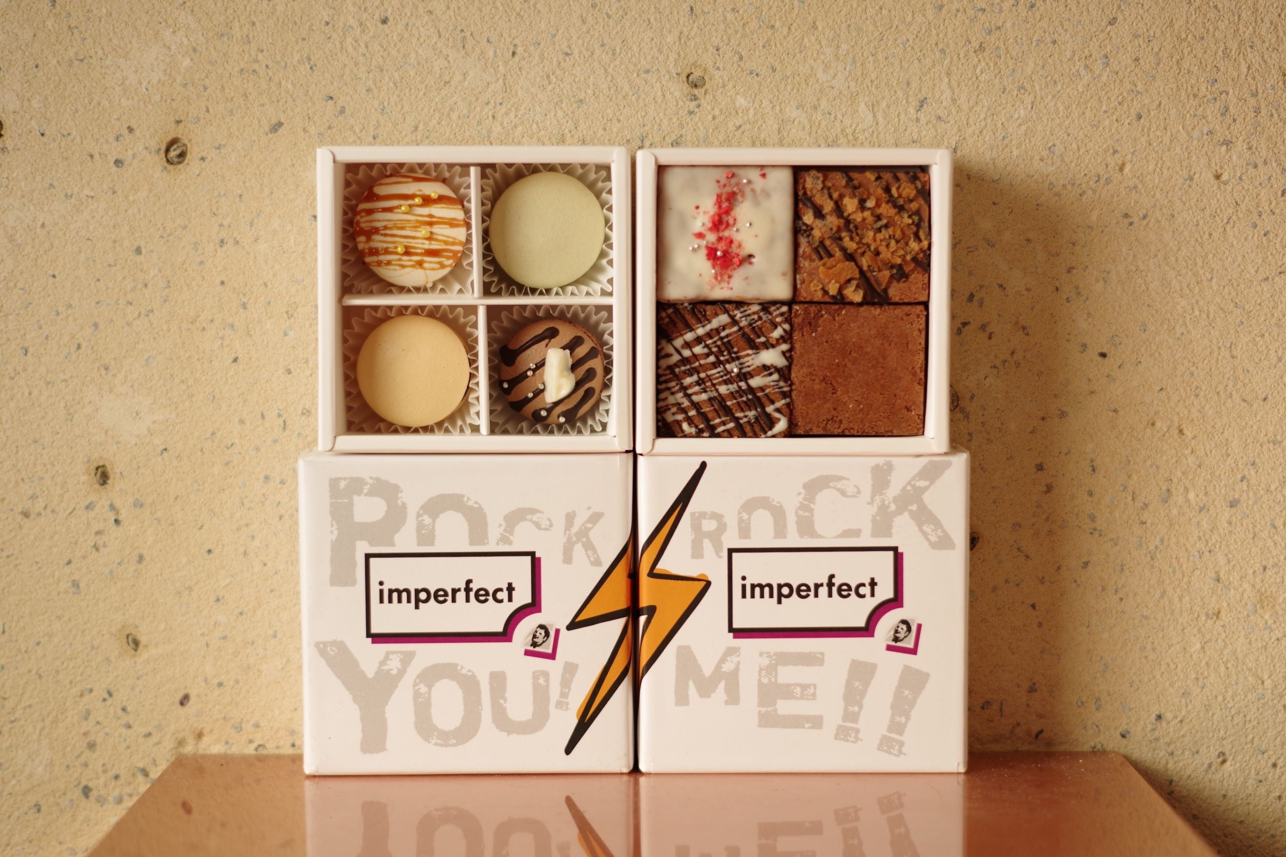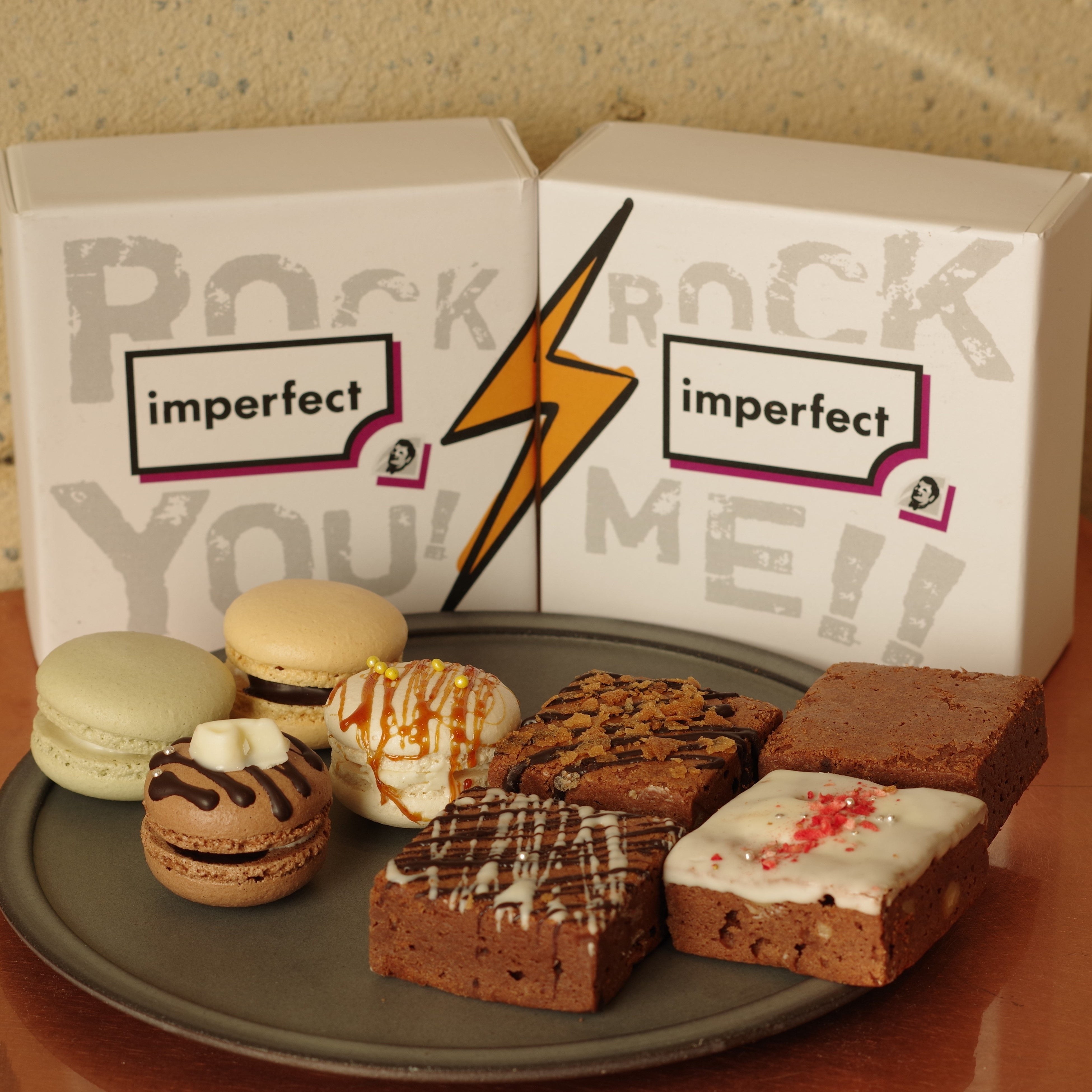 imperfectさんの素敵な活動にハンサムらしさを、という意味を込めて、どちらもしっかり主張できるようなデザインの箱、マカロン、ブラウニーを作らせて頂きました。
