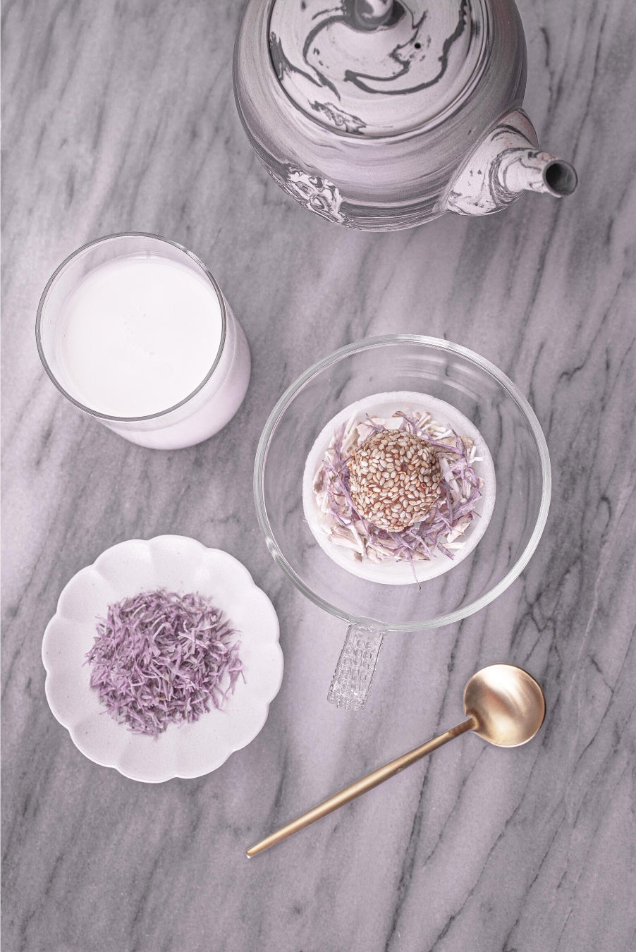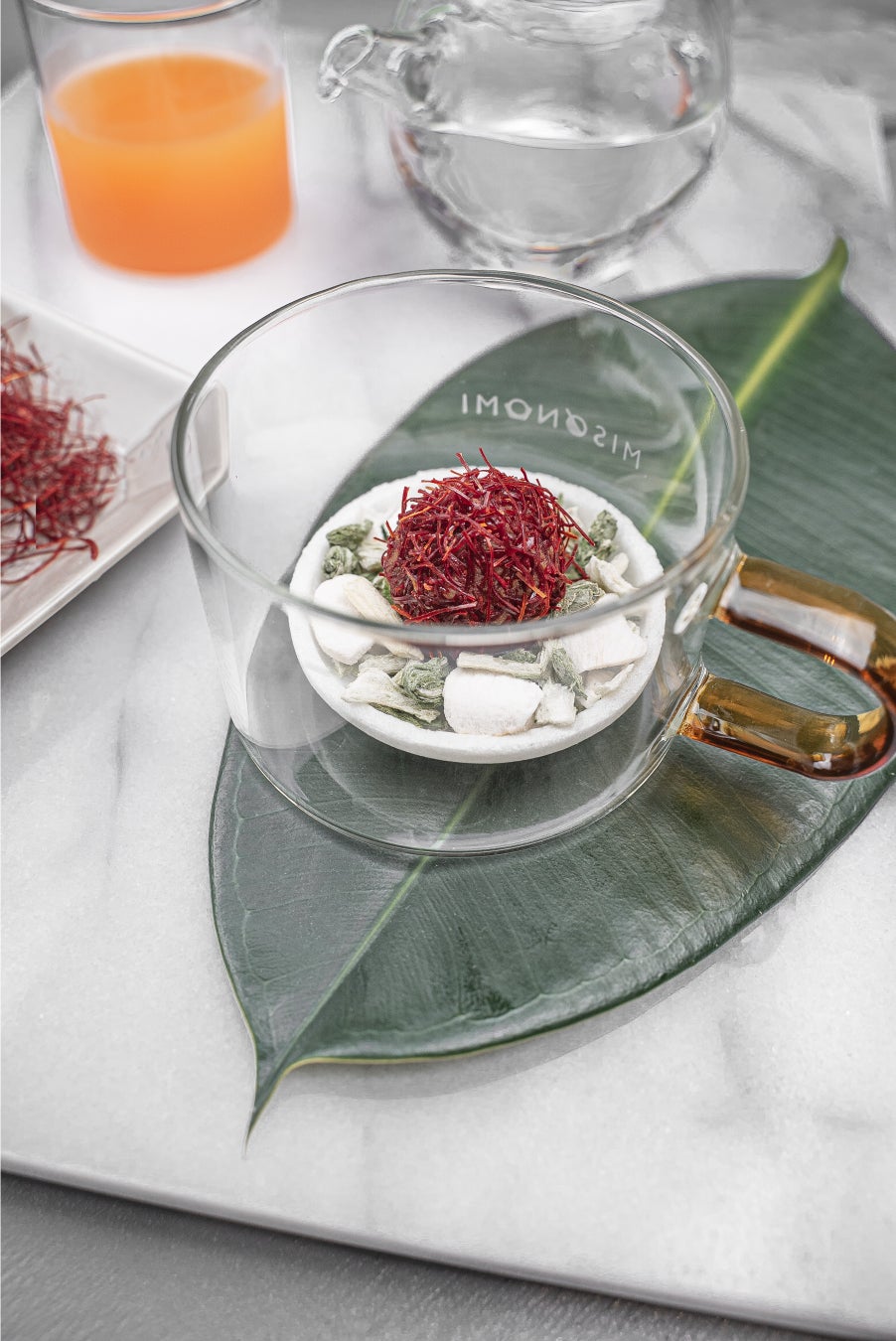 独特の香りと食感が魅力の舞茸とえのきに、秋の花でもある色鮮やかな菊の花びらを添えたスープ。米みそには白ごまをトッピングし、華やかなビジュアルでありながら、食欲をそそる香ばしい食材が組み合わさった秋の花咲く新感覚の一杯。