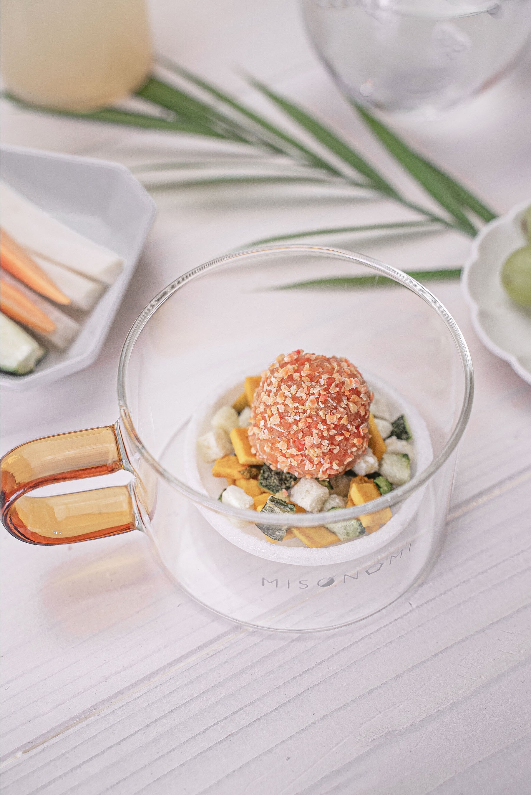 独特の香りと食感が魅力の舞茸とえのきに、秋の花でもある色鮮やかな菊の花びらを添えたスープ。米みそには白ごまをトッピングし、華やかなビジュアルでありながら、食欲をそそる香ばしい食材が組み合わさった秋の花咲く新感覚の一杯。