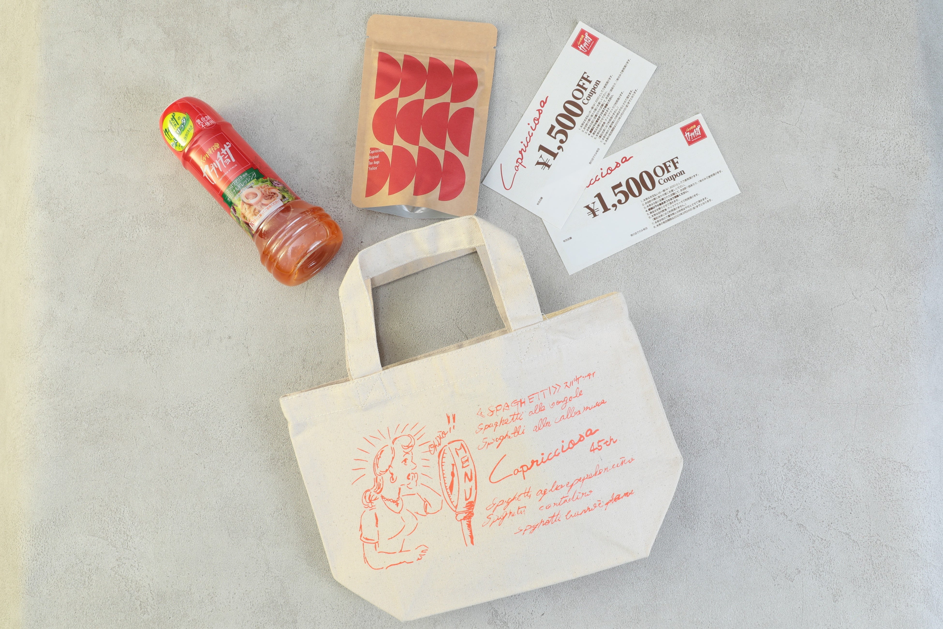 新たに迎える2023年は、カプリチョーザ創業45周年となる記念すべき年。この福袋のために制作されたトートバッグは、これを記念し、カプリチョーザ創業者である本多征昭氏の手書きメニューをモチーフとしたデザインで仕上げました。普段使いにぴったりなカジュアルさを備えた、カプリチョーザならではのオリジナルアイテムとなっています。