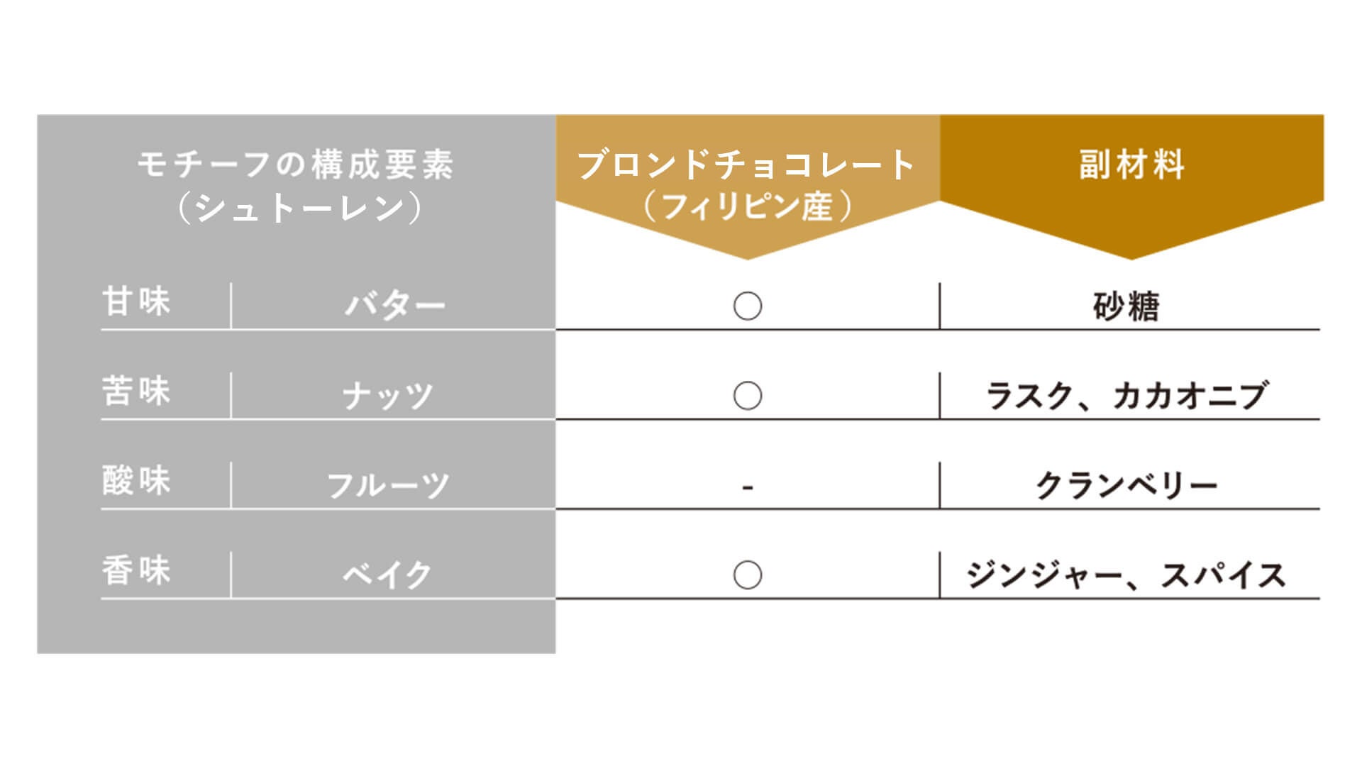 シュトーレンの構成要素を「バター(甘味)」・「ナッツ(苦味)」・「フルーツ(酸味)」・「ベイク(香味)」の4つに分類しました。