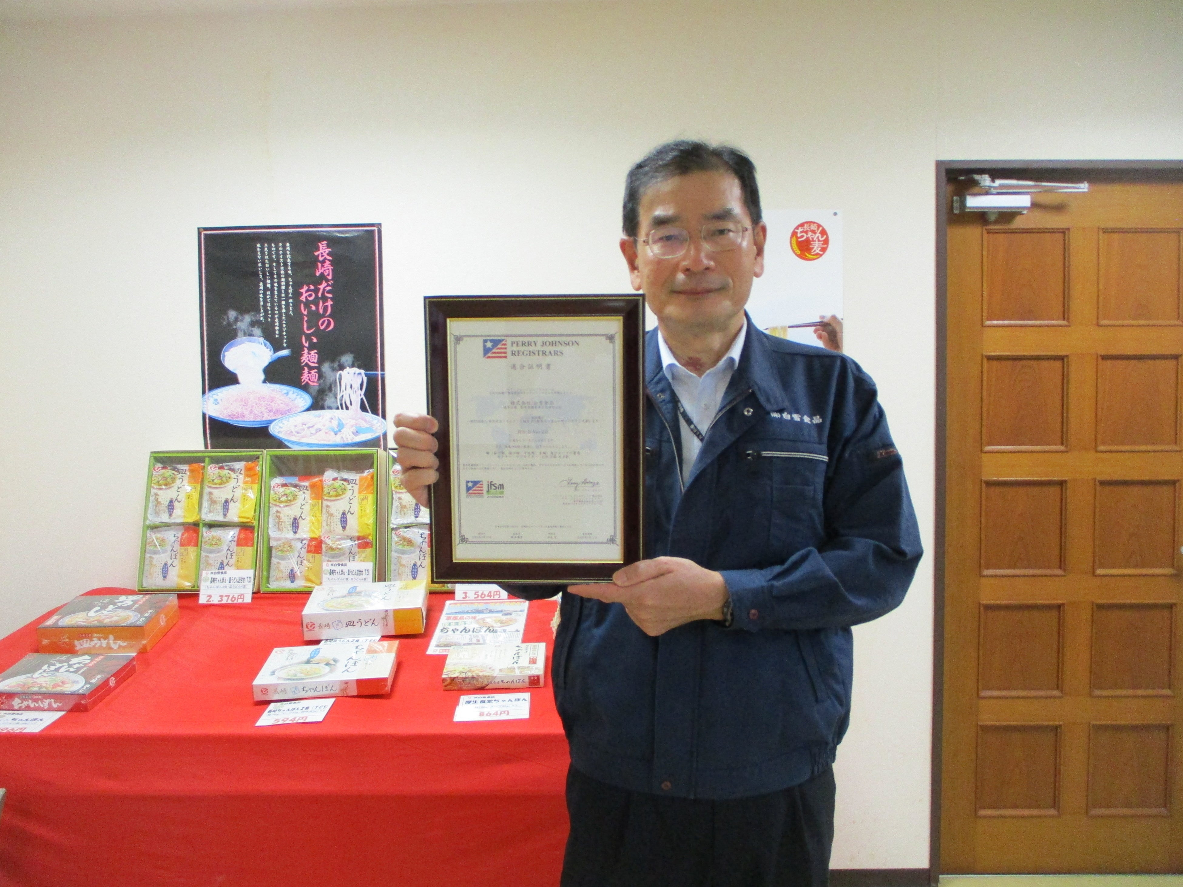 このたび、HACCP制度化に対応し、取引先や消費者のみなさまにより安心して長崎ちゃんぽんや皿うどんを食べてもらうため、JFS-B規格の適合証明を取得しました。引き続き自社で規格に対応する食品安全体制を構築しており、規格監査での指摘を従業員のさらなる食品安全意識の向上に役立て、また、規格の定期監査を継続的に受け続けることで、第三者のチェックが入った安心安全な長崎ちゃんぽん・皿うどんを全国のみなさまに自信を持って届けたいと考えています。