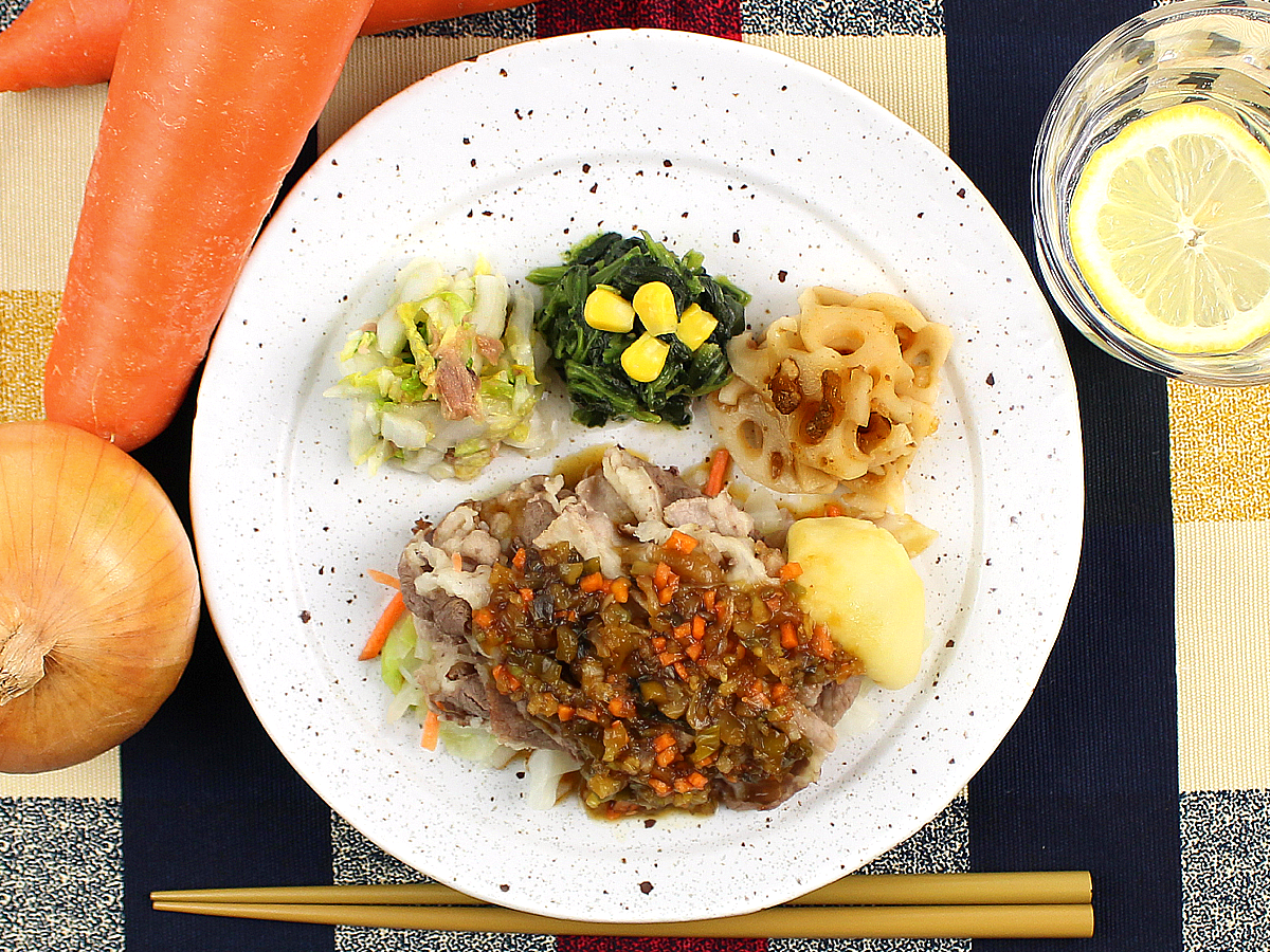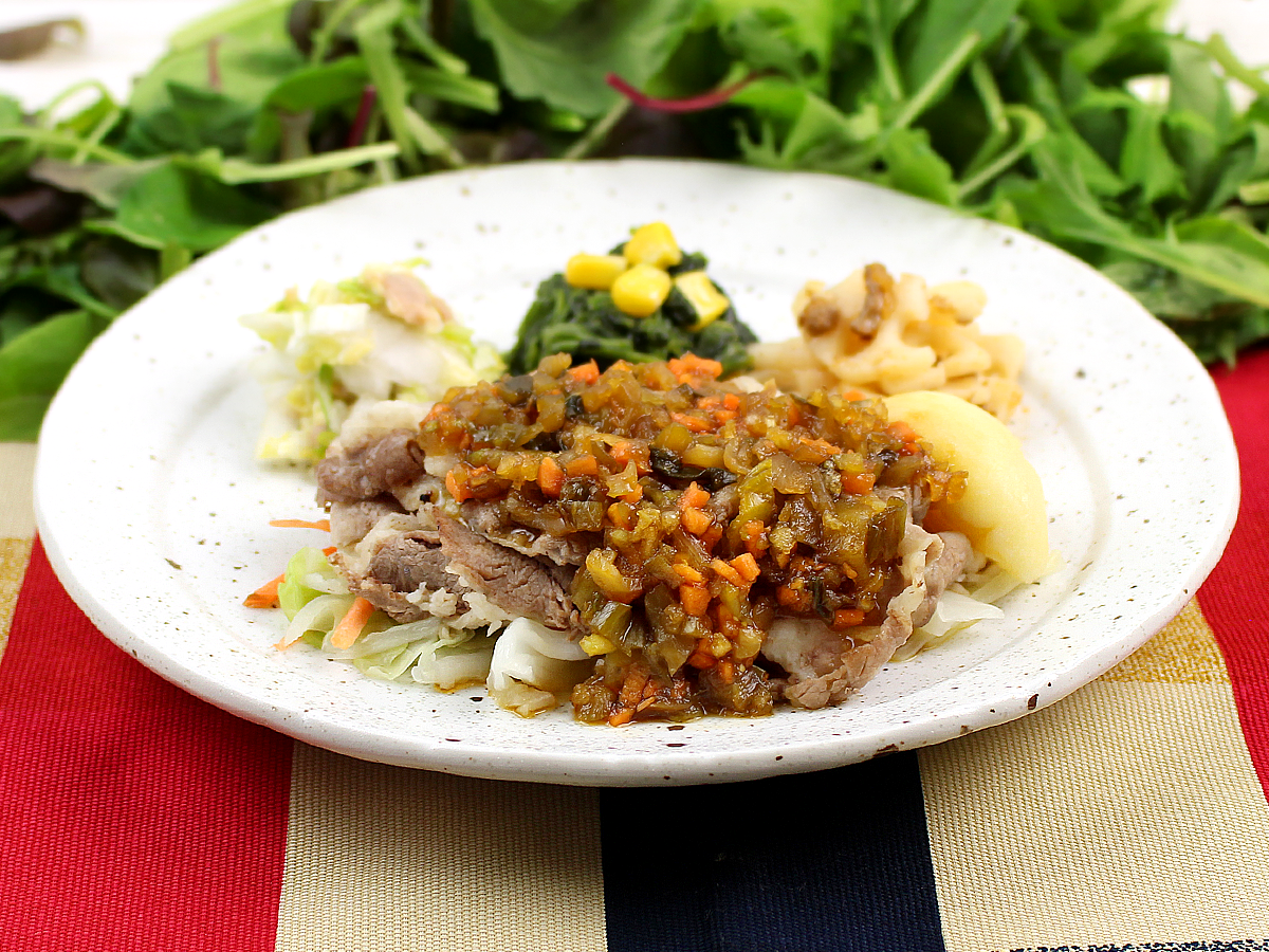 薄くスライスした牛バラ肉にザーサイや高菜漬け、人参、セロリ、玉葱の香味野菜を混ぜ合わせて、甘めに味付けした濃厚醤油だれをかけました。添えております野菜はキャベツと人参、揚げたジャガイモです。お漬物の塩味と醤油だれの甘みをお楽しみください。