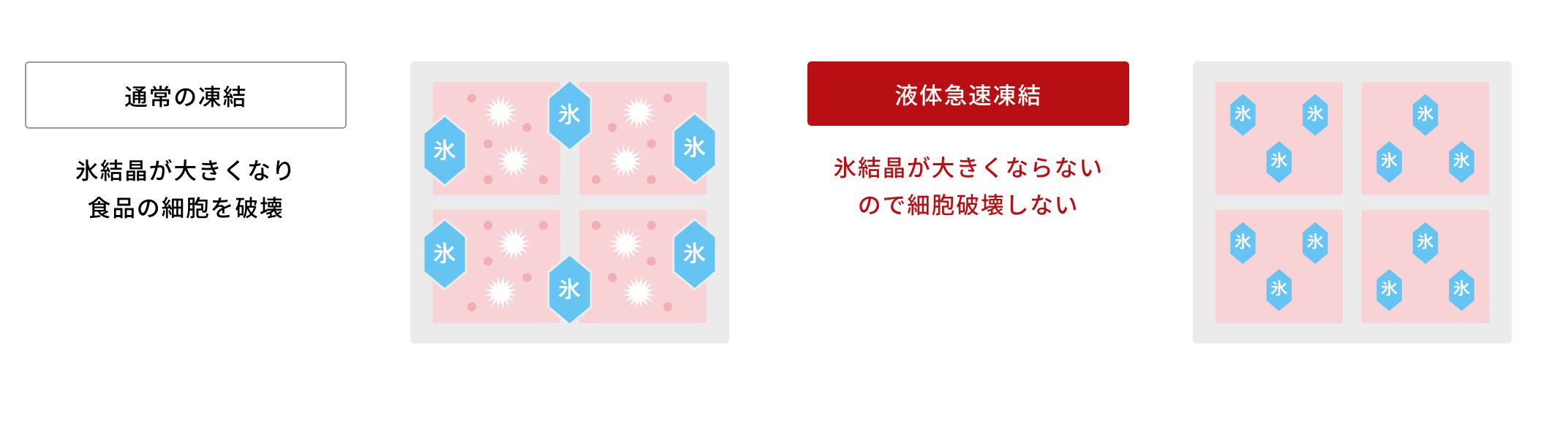 氷結晶が大きくならないことで食材の細胞破壊、ドリップの流出を防ぎ、凍結前の鮮度維持を実現します。