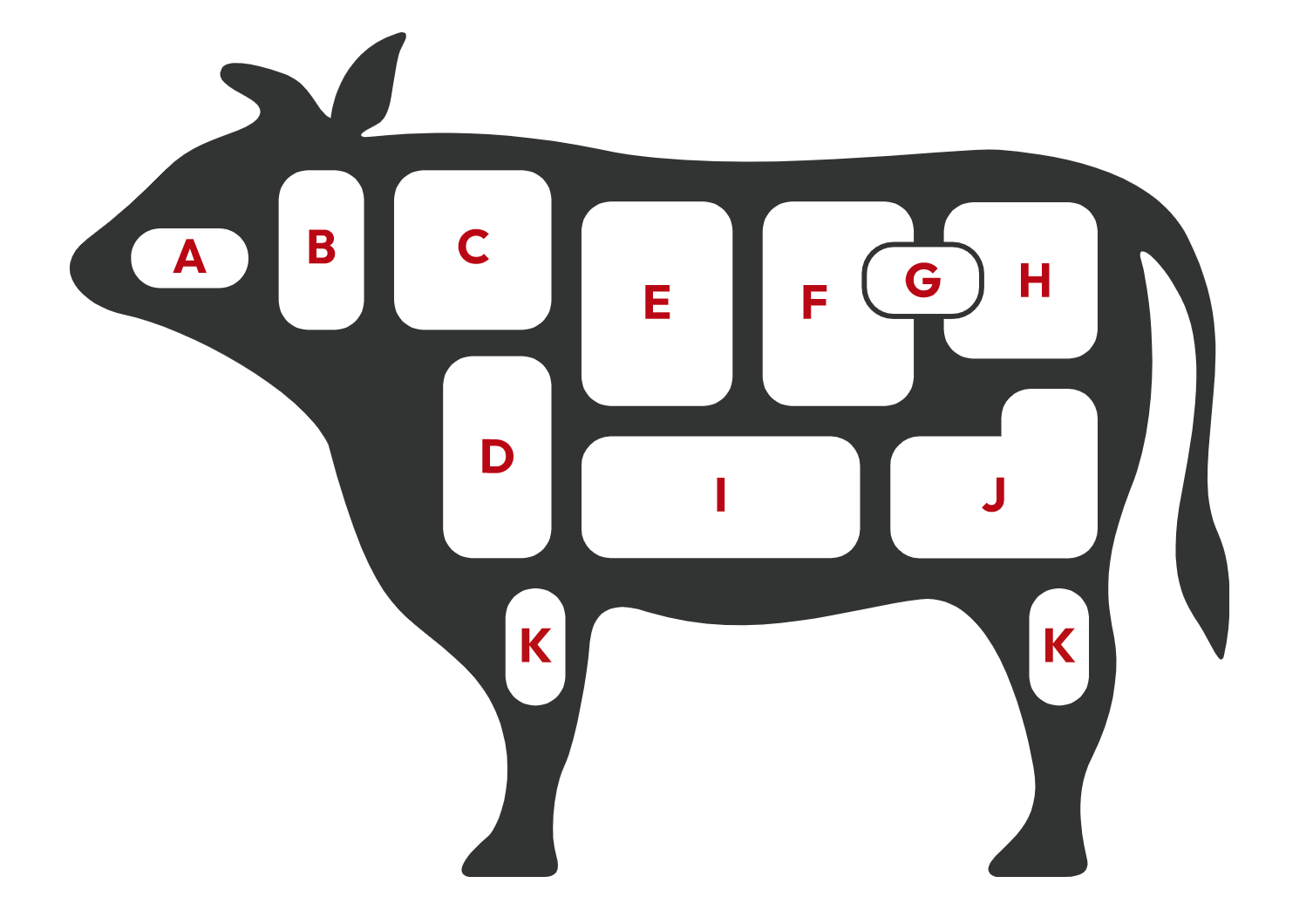 A:タン B:ネック C:カタロース D:ウデ E:リブロース F:サーロイン G:ヒレ H:ランプ I:バラ J:モモ K:スネ