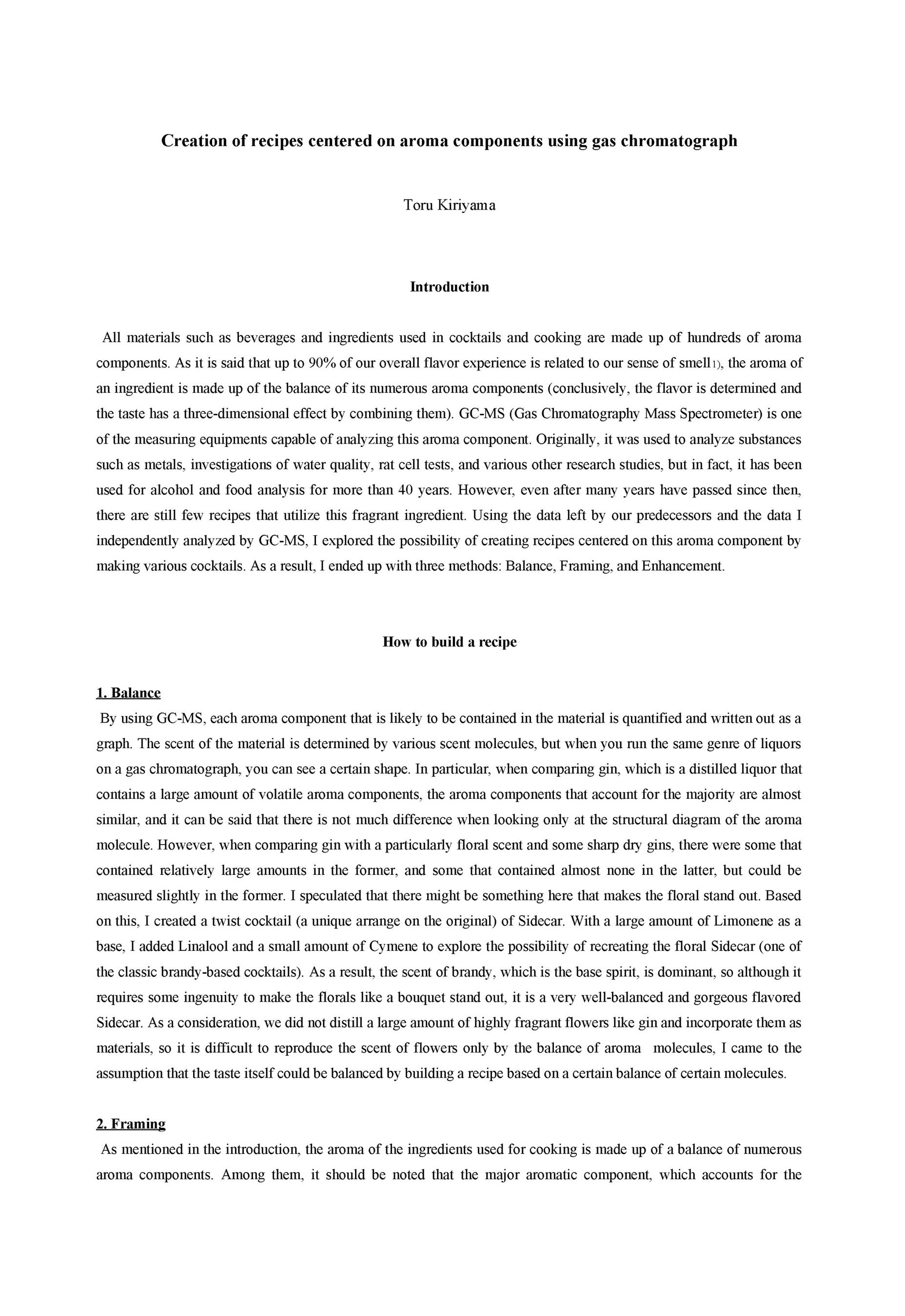 サイトでは上記の解釈を当てはめ制作したカクテルも紹介している。今までは作り手の感覚を頼りに作られてきたレシピが、これによりロジカルな説明をすることが出来る。人は説明され納得することで、その物や経験に価値を感じると言われ、香気成分によるレシピ構築はその点を十二分に活用する形となる。